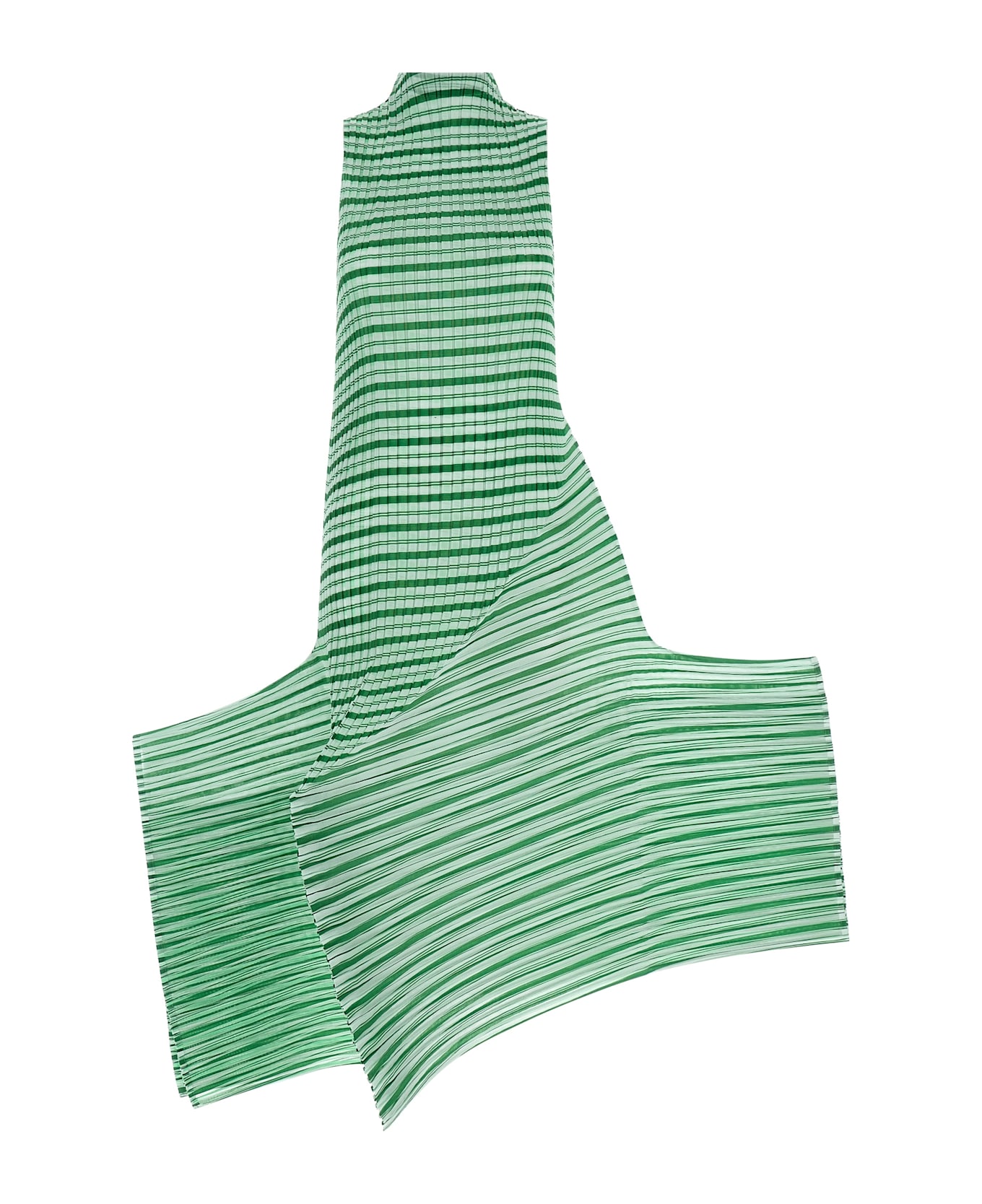 Long 'Generic Stripes (Machine Pleats)' dress in semi-transparent pleated fabric with striped moiré effect, high neck with button closure and back teardrop cut-out detail, sleeveless, asymmetrical hem with sculptural design.