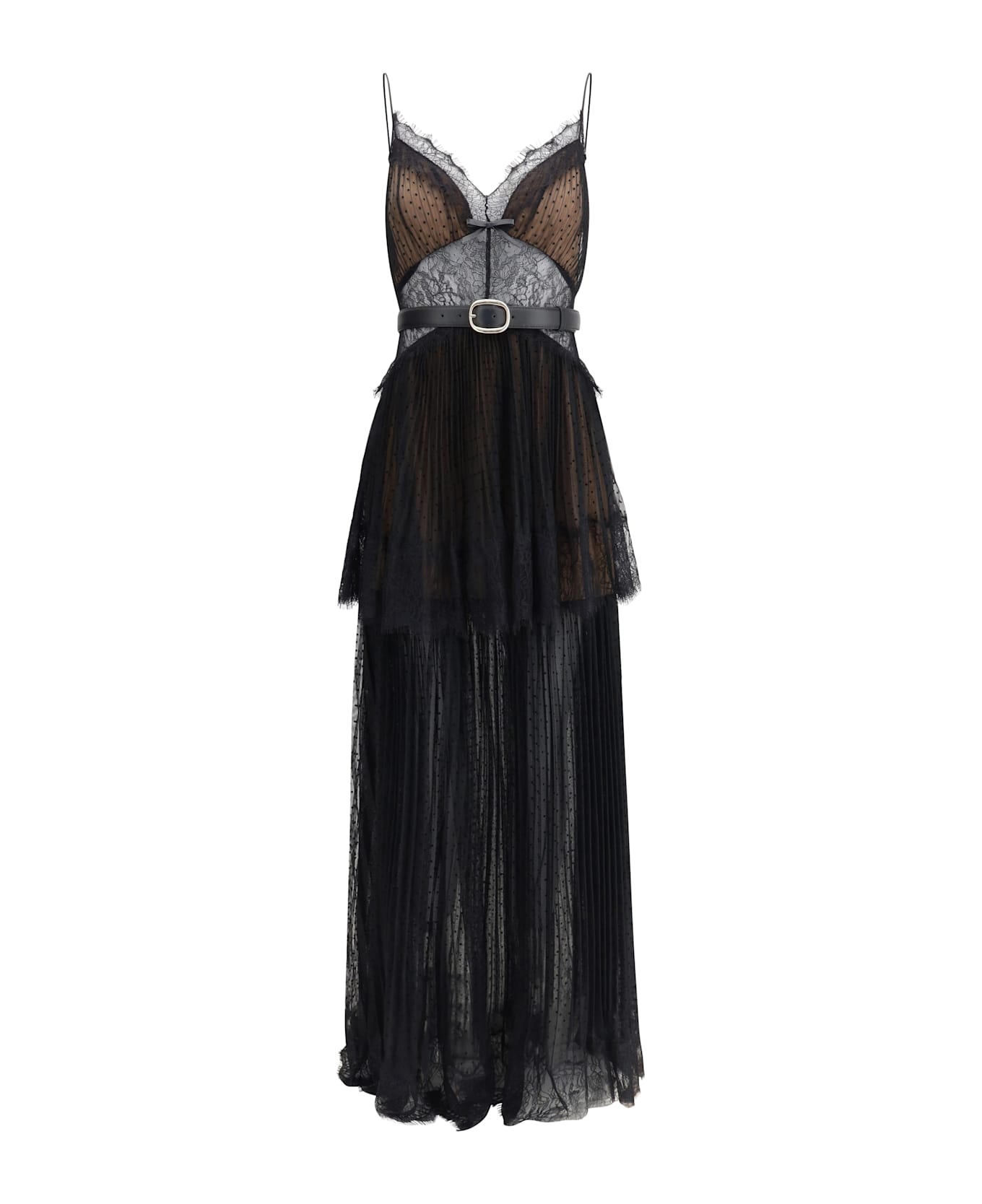 Long dress by self-portrait has a romantic and feminine design. featuring thin straps and a sweetheart neckline at the front, it features an elegant semi-sheer lace bodice that gives a delicate and sophisticated touch. the back zipper closure ensures a clean line, while the removable belt allows you to define the silhouette with versatility. complemented by a ruffle skirt, which adds movement and lightness. perfect for elegant events and ceremonies.