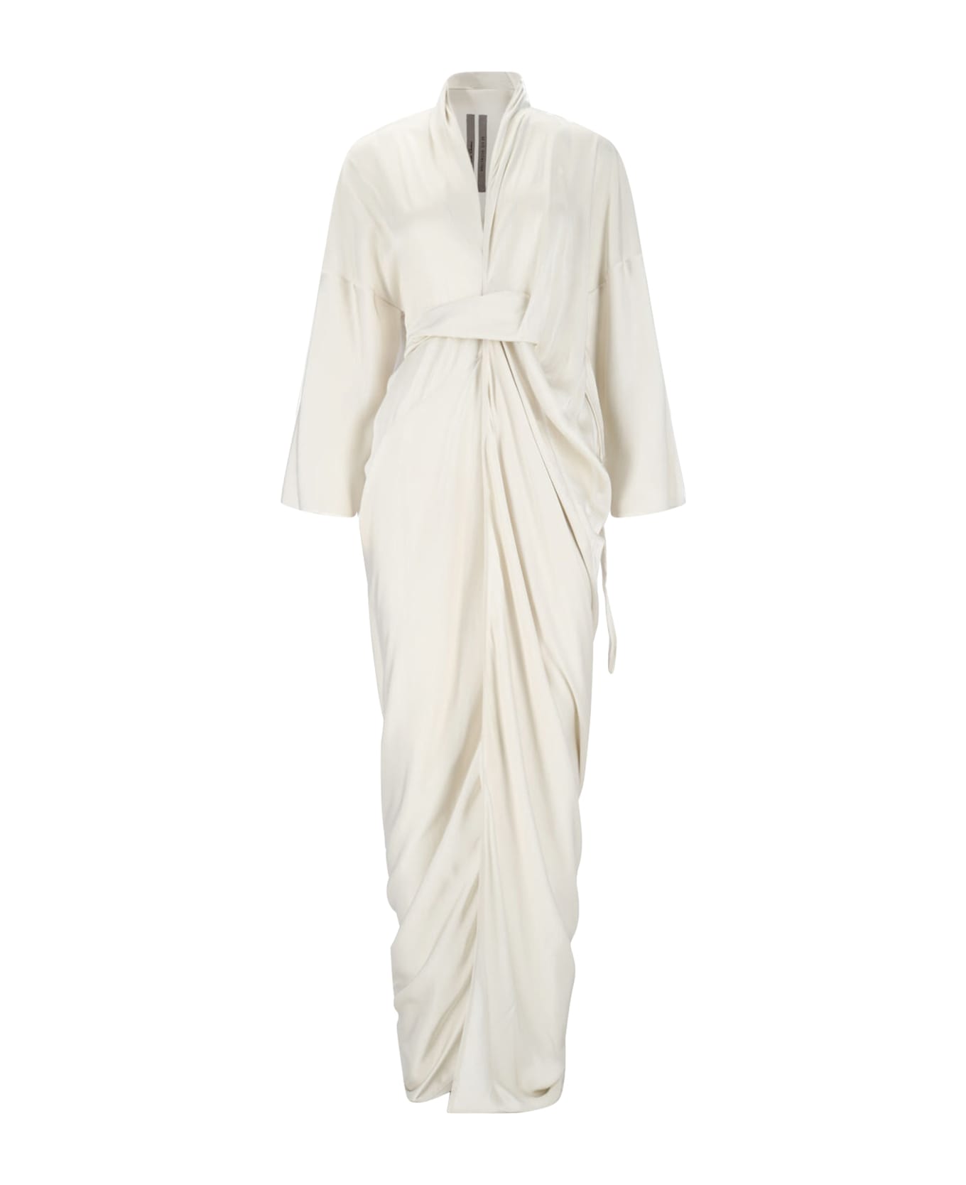 Rick Owens belted maxi dress in white fabric with draped details, V-split, removable waist belt, deep side split, straight hem.