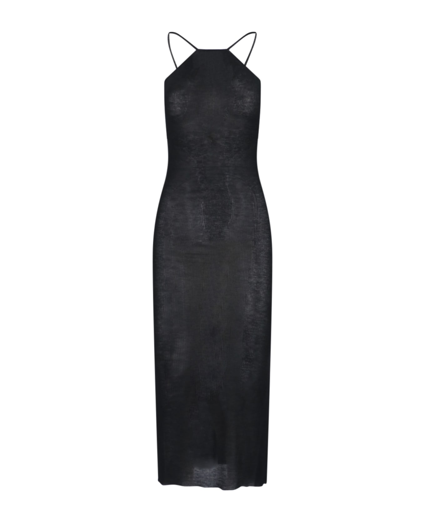 Rick Owens black fabric midi dress with ribbed pattern, back U-neck, sleeveless, thin straps, straight hem.