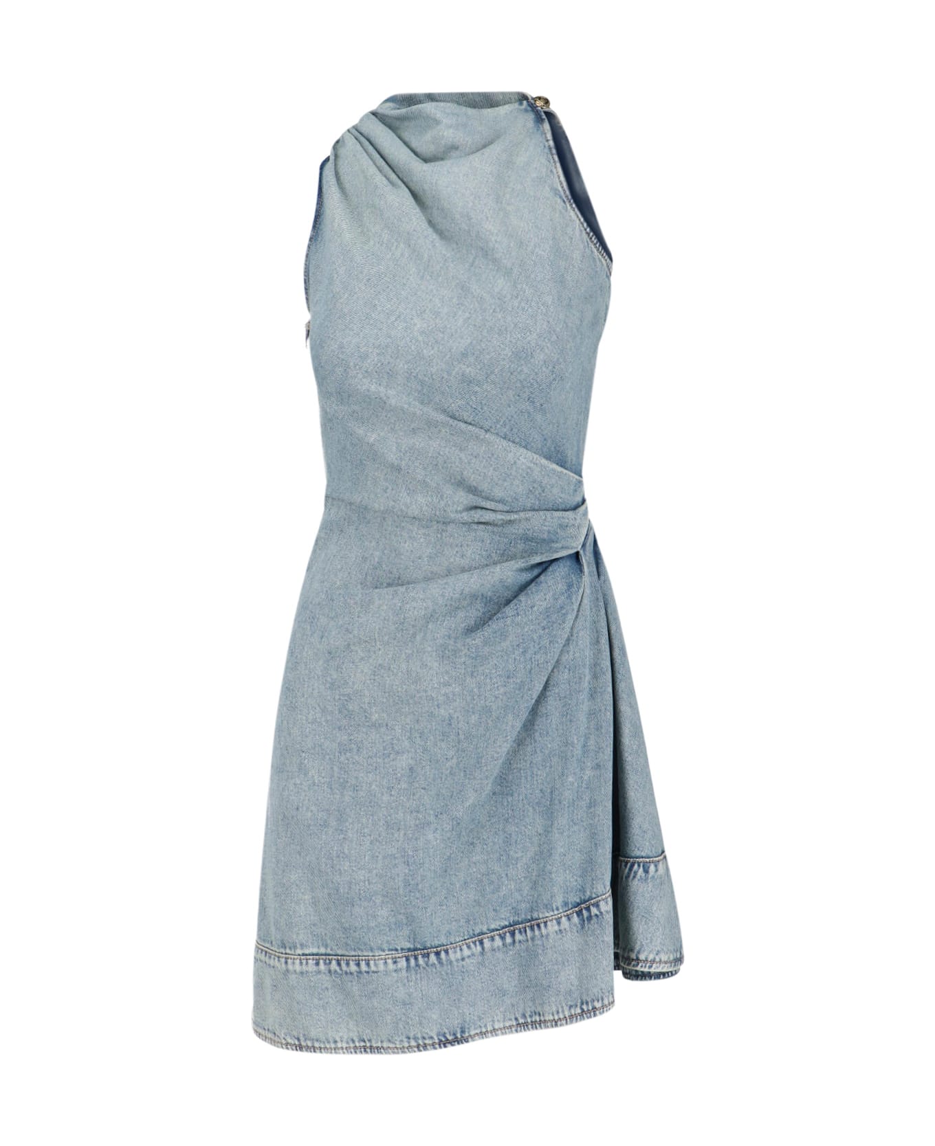 Alexander McQueen sleeveless midi dress in light blue cotton denim with side zip closure, front curled front, gold metal embossed logo button detail, and asymmetrical hem. Composition: 100% Cotton