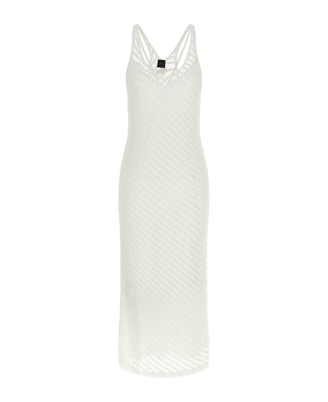 Long 'Miraggio' mesh viscose blend dress with all-over micro sequin application, straight silhouette, wide V-neck, rowing neck and back logo patch, sleeveless, removable petticoat.
