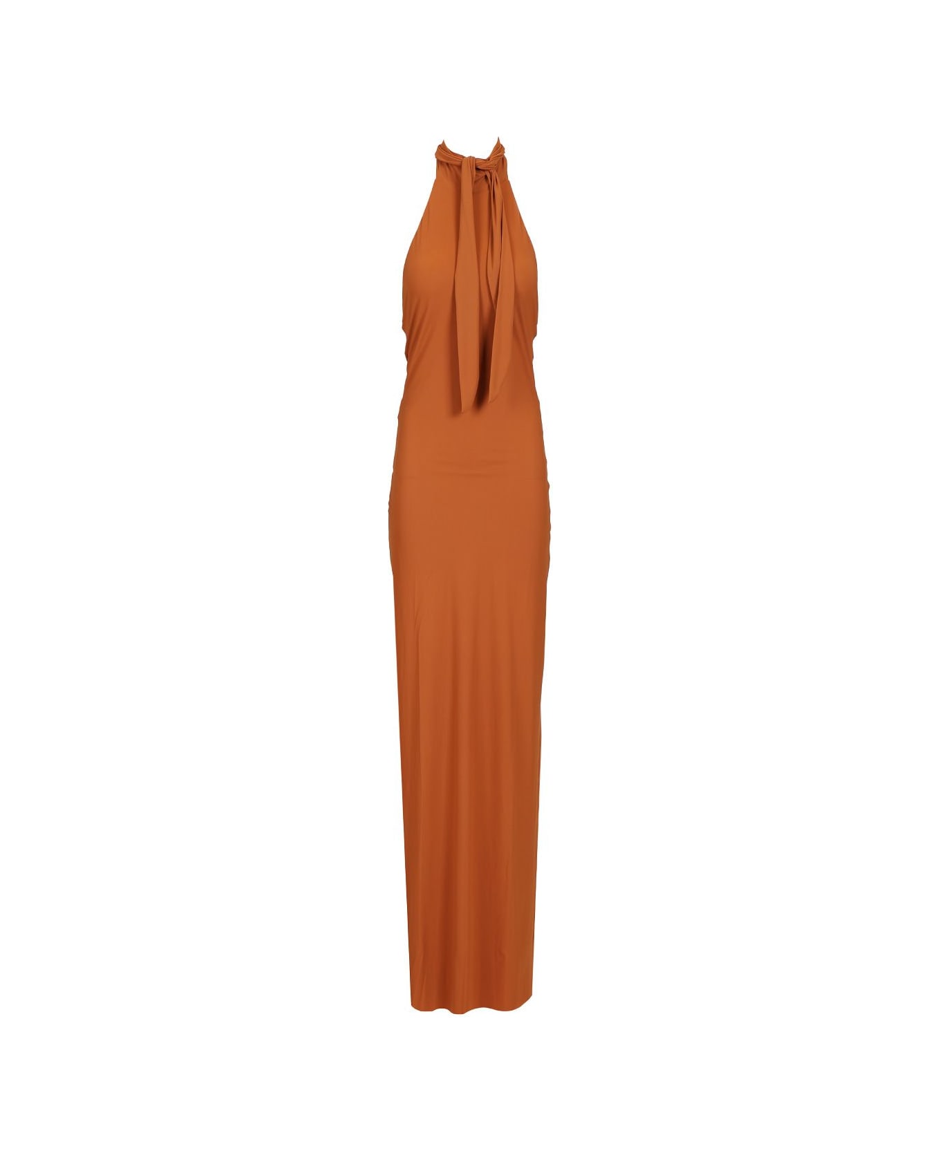 "MYLA" long dress with halterneck in stretch jersey by Amazuin, with low back and characteristic cut-out, skirt with a raw cut hem