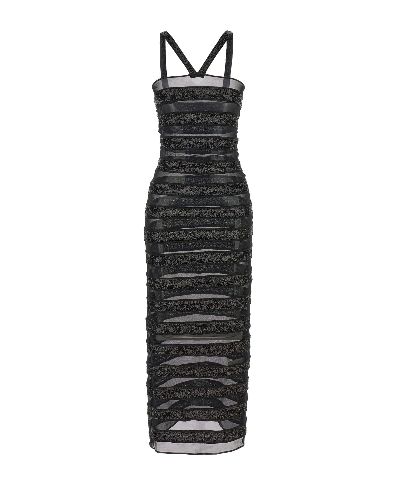 'Paillettes Stripes' dress in transparent mesh fabric with sequins, thin straps.