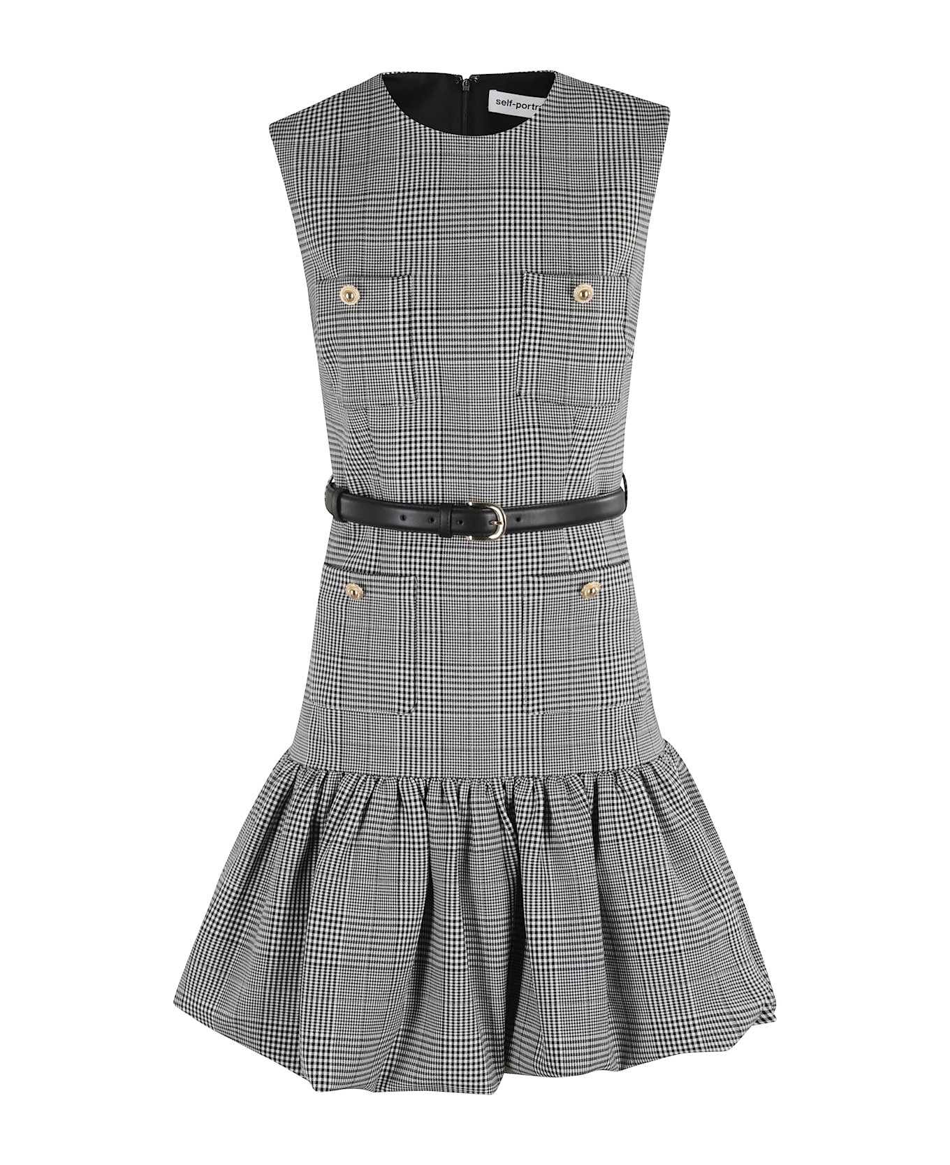 Dress - Self-Portrait - Black and white color - Mini model - Sleeveless - Four gold button pockets on front - Balloon skirt - Waist loops - Removable belt - Back zipper closure