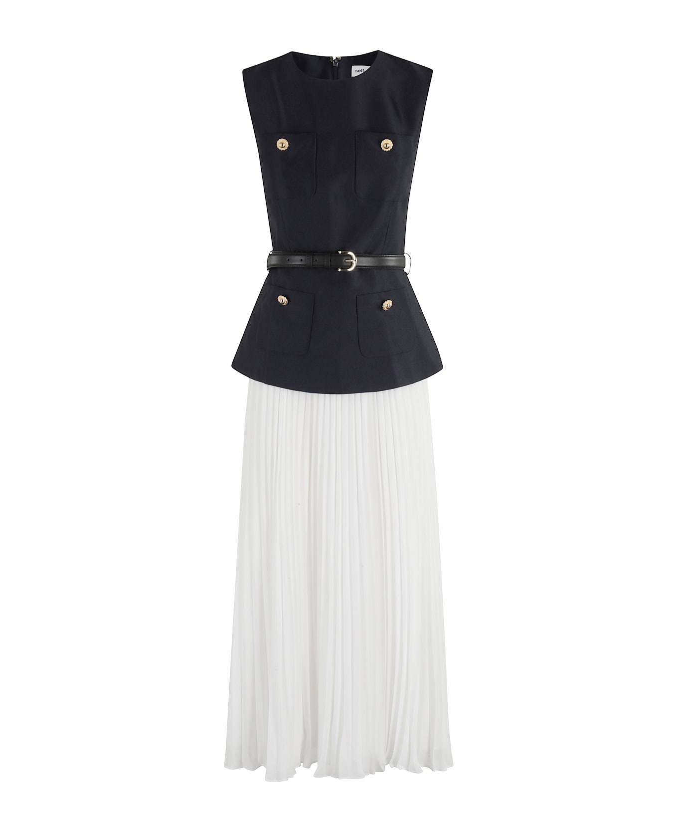 Dress - Self-Portrait - White and blue color - Sleeveless - Round neckline - Four front pockets with gold buttons - Skirt with white pleated petticoat contrail - Waist loops - Back zipper closure