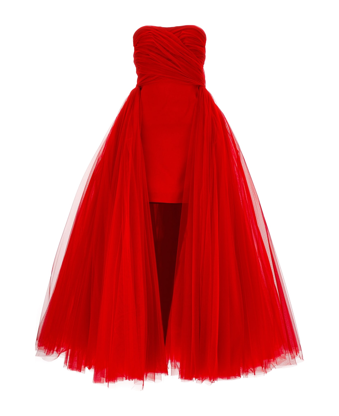 Off-the-shoulder tulle and crepe dress, back zip closure, short skirt and tulle train.