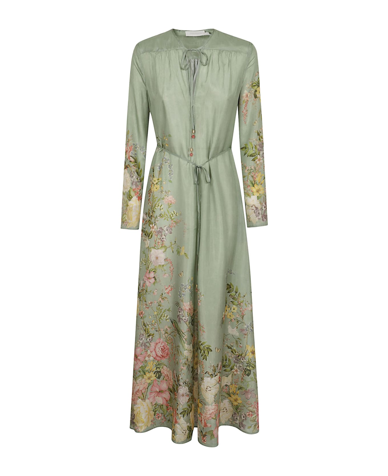 Waverly Billow maxi dress with positioned print in silk BY ZIMMERMANN. Stand-up collar with laces; pockets in the side seams; removable waist belt and finished with gathers.