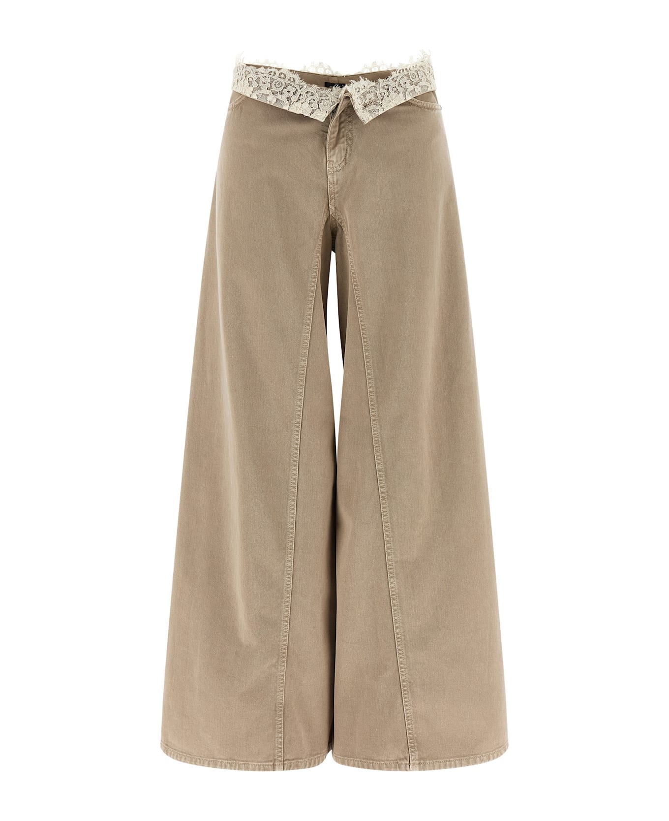 'Winona' discolored-effect cotton bull denim jeans, extra wide leg, waist with contrast lace insert, pockets, zip and snap button closure that allows the model to be worn in two ways: high waist for a monochromatic effect or turned-up waist with lace in sight.