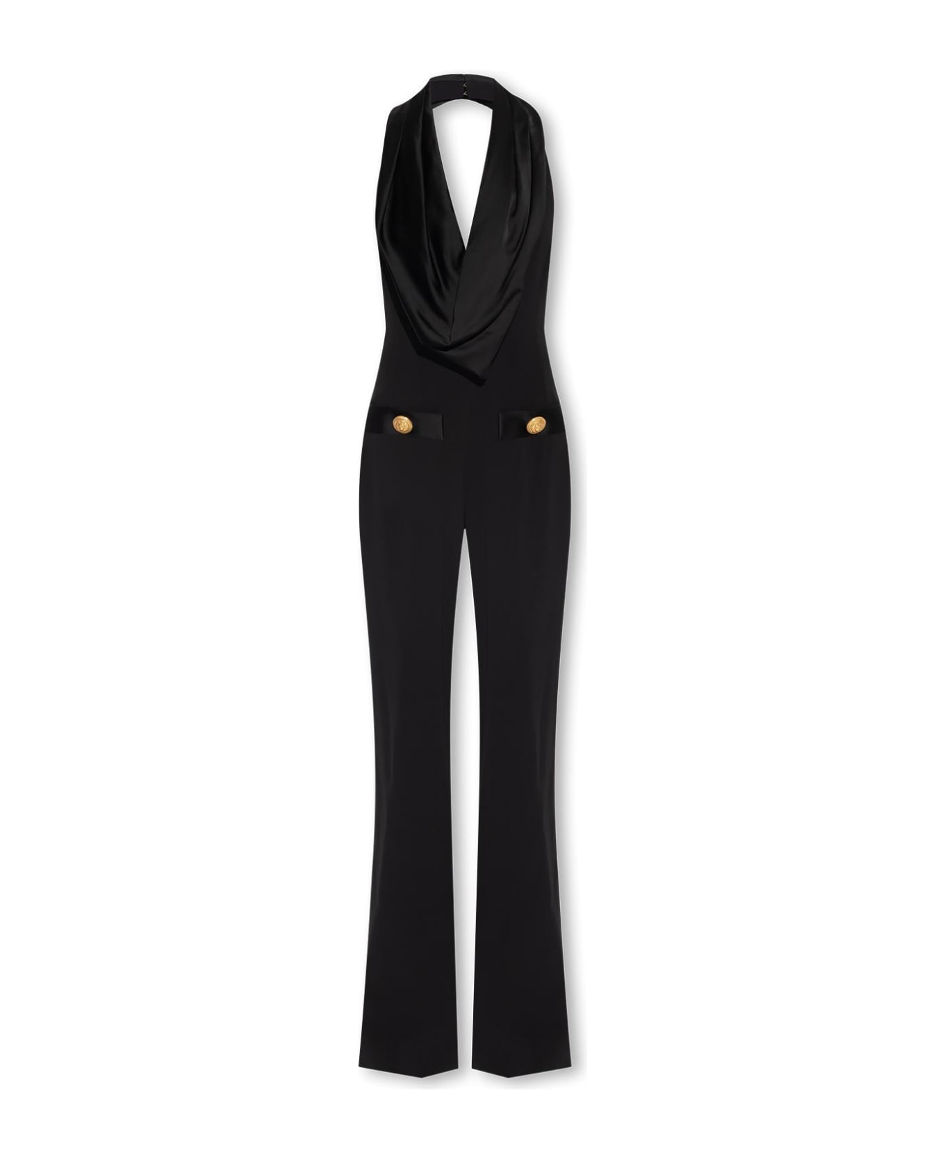 Black jumpsuit with denuded shoulders from Balmain. Spun from viscose, this style fastens with a back zipper and hook & eye closures and features a cowl neckline, satin trims, flared legs and two decorative frontal pockets with the signature lion head.