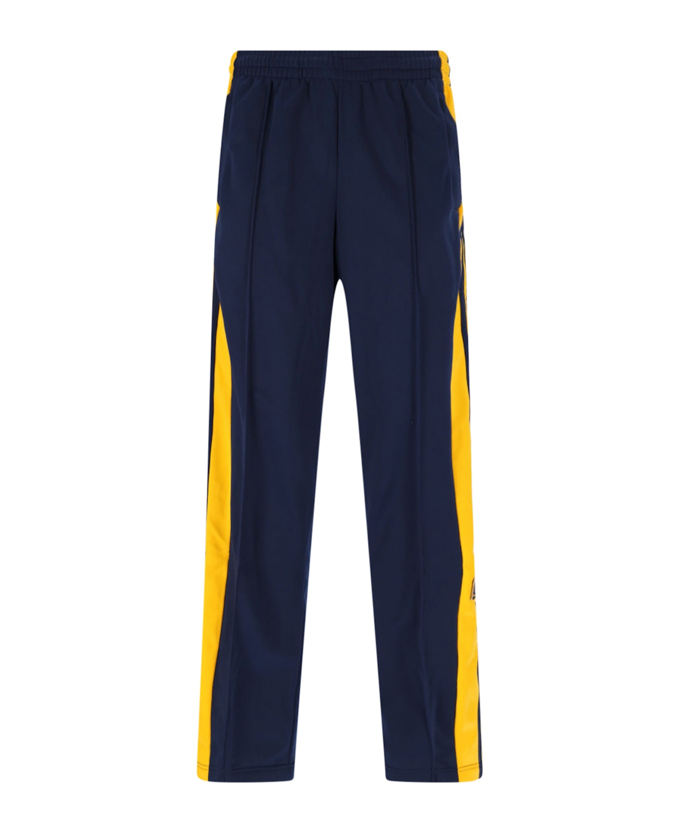 Adidas Adibreak blue fabric sports pants with yellow trim, mid elastic waistband, two side pockets, iconic black side bands, logo label detail, side snap buttons, straight leg.