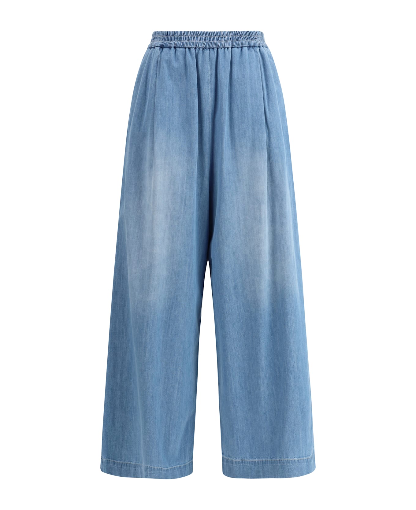 Fabiana filippi's wide leg pants combine comfort and style with a loose, flowing design that gives a sleek, contemporary silhouette. the elasticated waistband offers a comfortable fit and practicality, while the two side welt pockets add a discreet touch of functionality. the denim-effect design gives the garment a versatile, casual chic feel, making them perfect for an everyday yet sophisticated look. ideal for pairing with tops or shirts, these pants are a must-have for those looking for style and comfort in one.