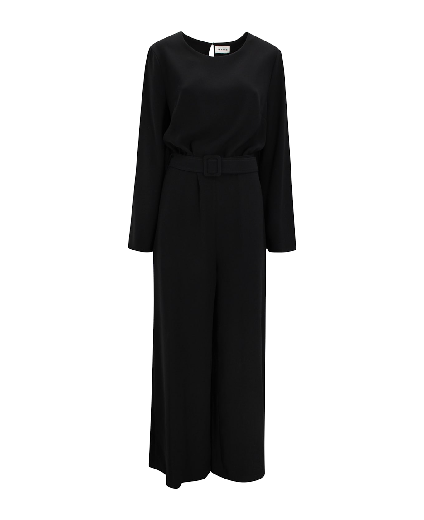 Sleeveless jumpsuit with belt. A clean, essential jumpsuit made from fluid fabric, featuring long sleeves and a straight leg for a comfortable and versatile fit. The minimal crew neckline and belt with buckle add a defined yet understated silhouette.