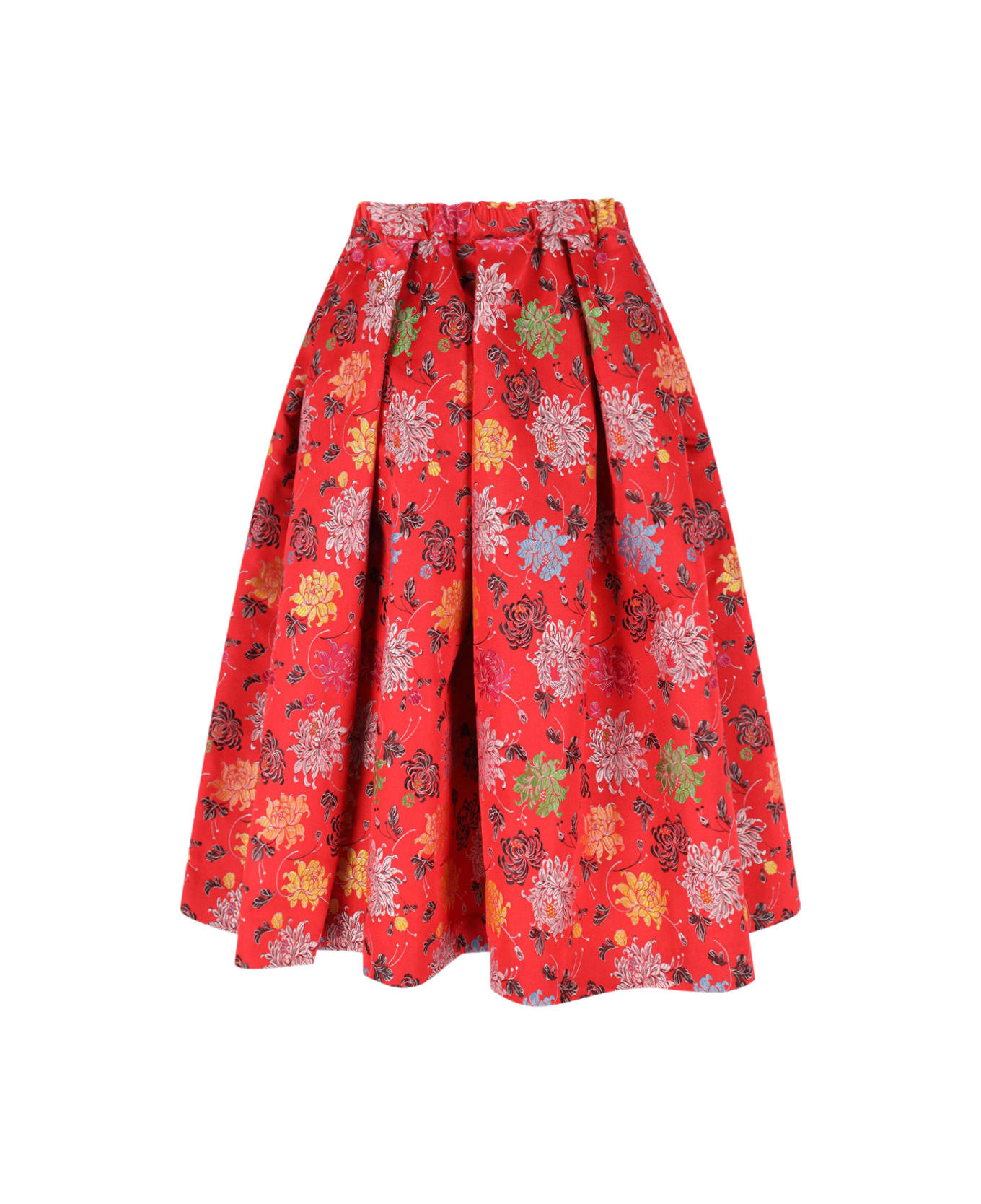 Comme Des Garçons flared midi skirt, red fabric, slip-on design, multicolor floral pattern print, elasticized high waist, draped details, two side pockets, raw cut. Composition: 100% Polyester