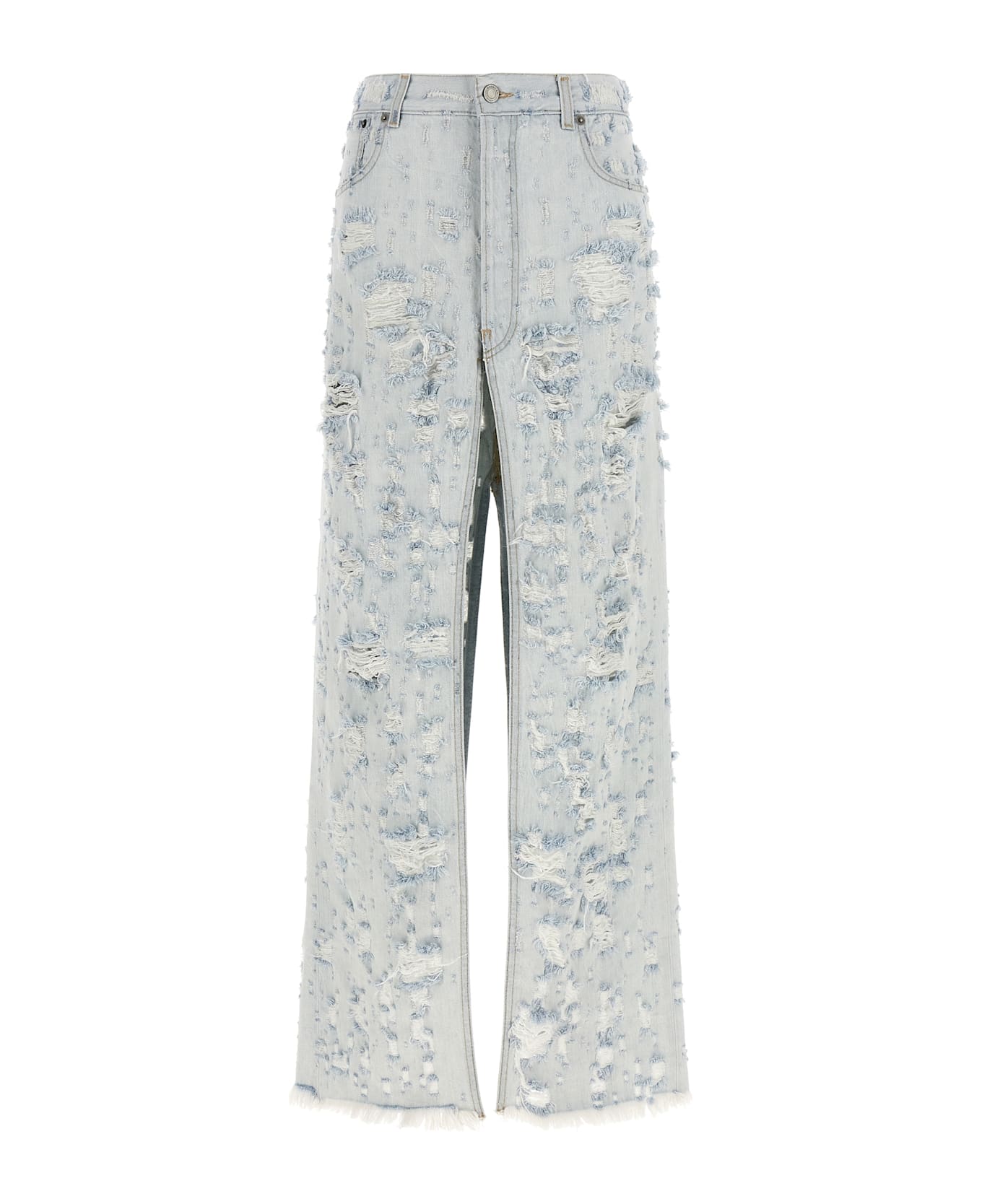 'Gana' long skirt in destroyed cotton denim with all-over rips and fraying, contrast stitching, wide front and back split, regular waist, front button closure, five pockets, back leather logo tag, garment with frayed raw cut hem.