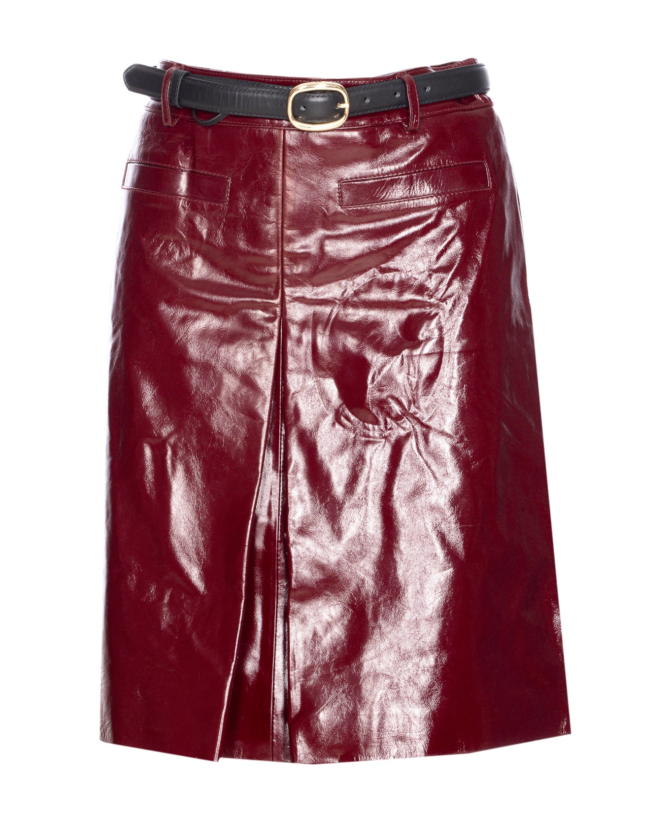 Self Portrait burgudy mini skirt, zip and hook closure, belt on waist, split detail, vinyl effect Composition: 100% Lamb Leather, 100% Polyeste