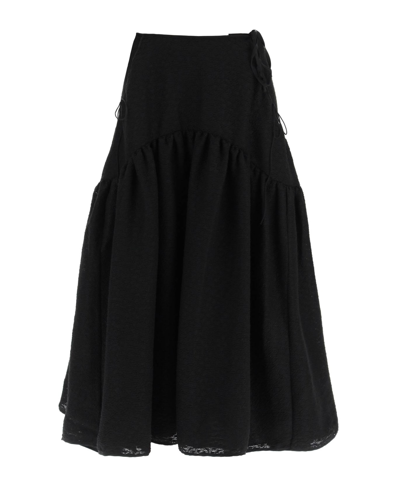 Cecilie Bahnsen high-waisted long skirt with maxi flounce and side pockets with ties, made of textured wool blend fabric. Front closure with hook-and-eyes and ties. The model is 177 cm tall and wears a size UK 8.