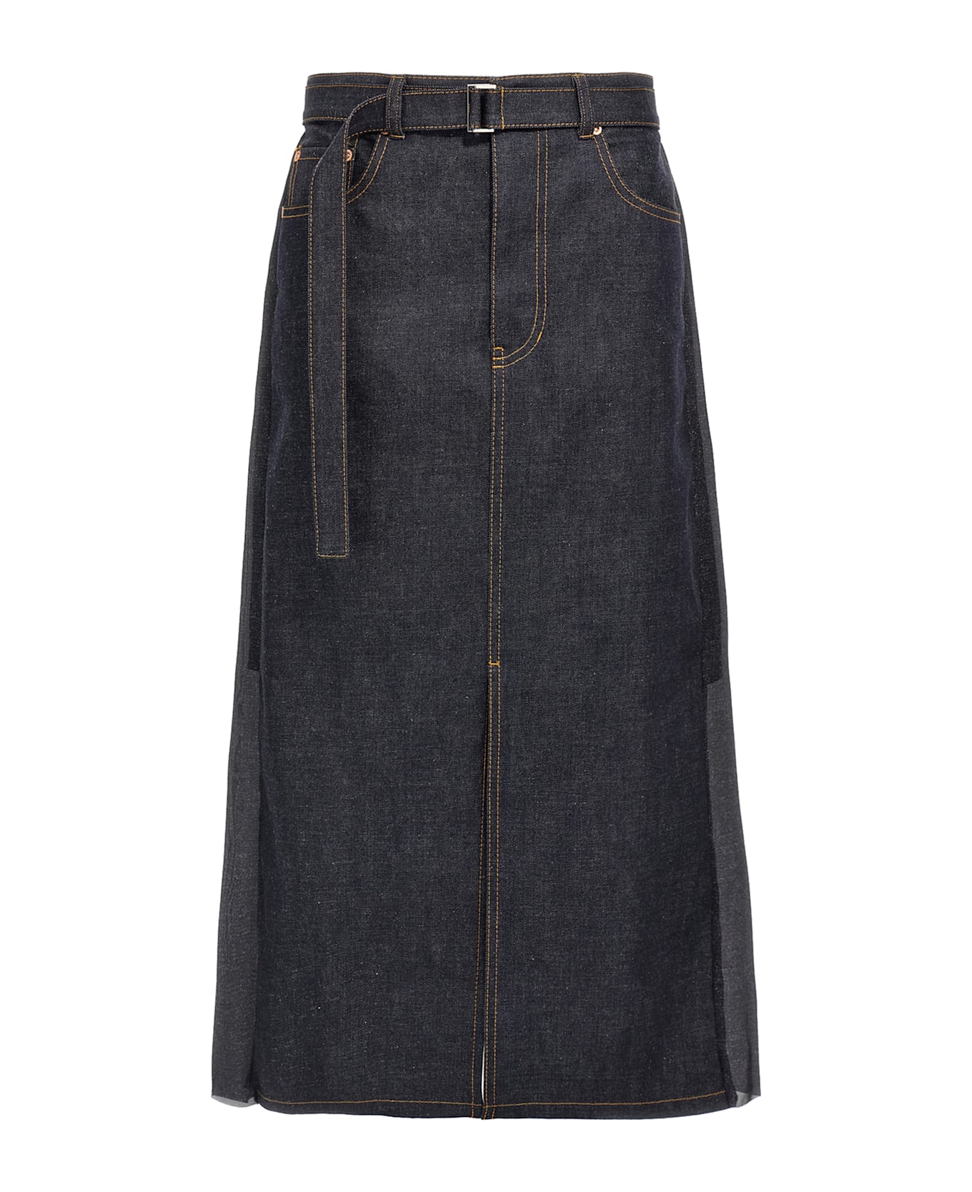 Longuette skirt in cotton denim with back insert in pleated denim print cupro, zip and button closure, pockets, front split, removable belt.