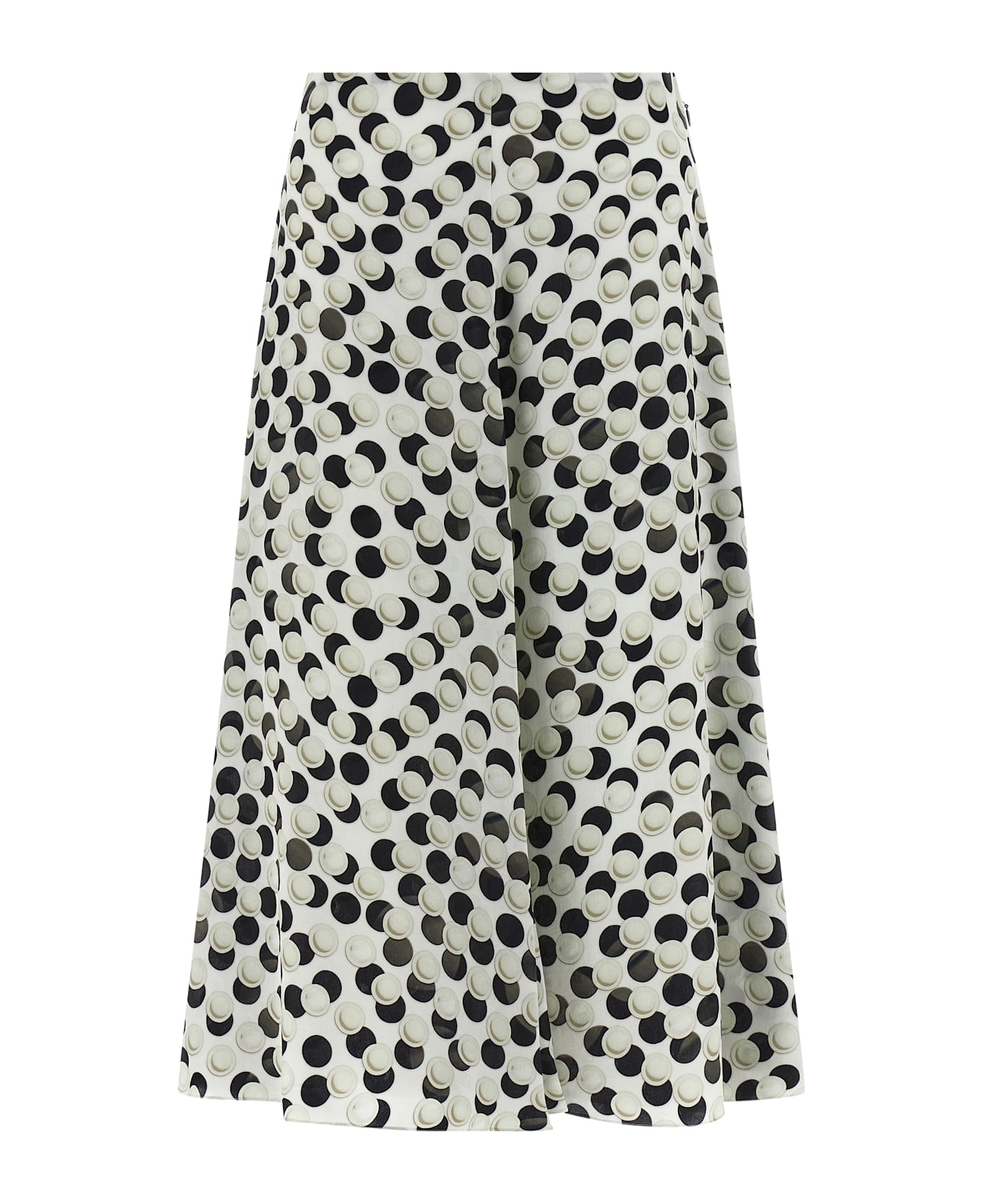 Jacquard polka dot patterned silk midi skirt, flared silhouette, side zip closure, lining, asymmetrical hem. Composition: 100% silk