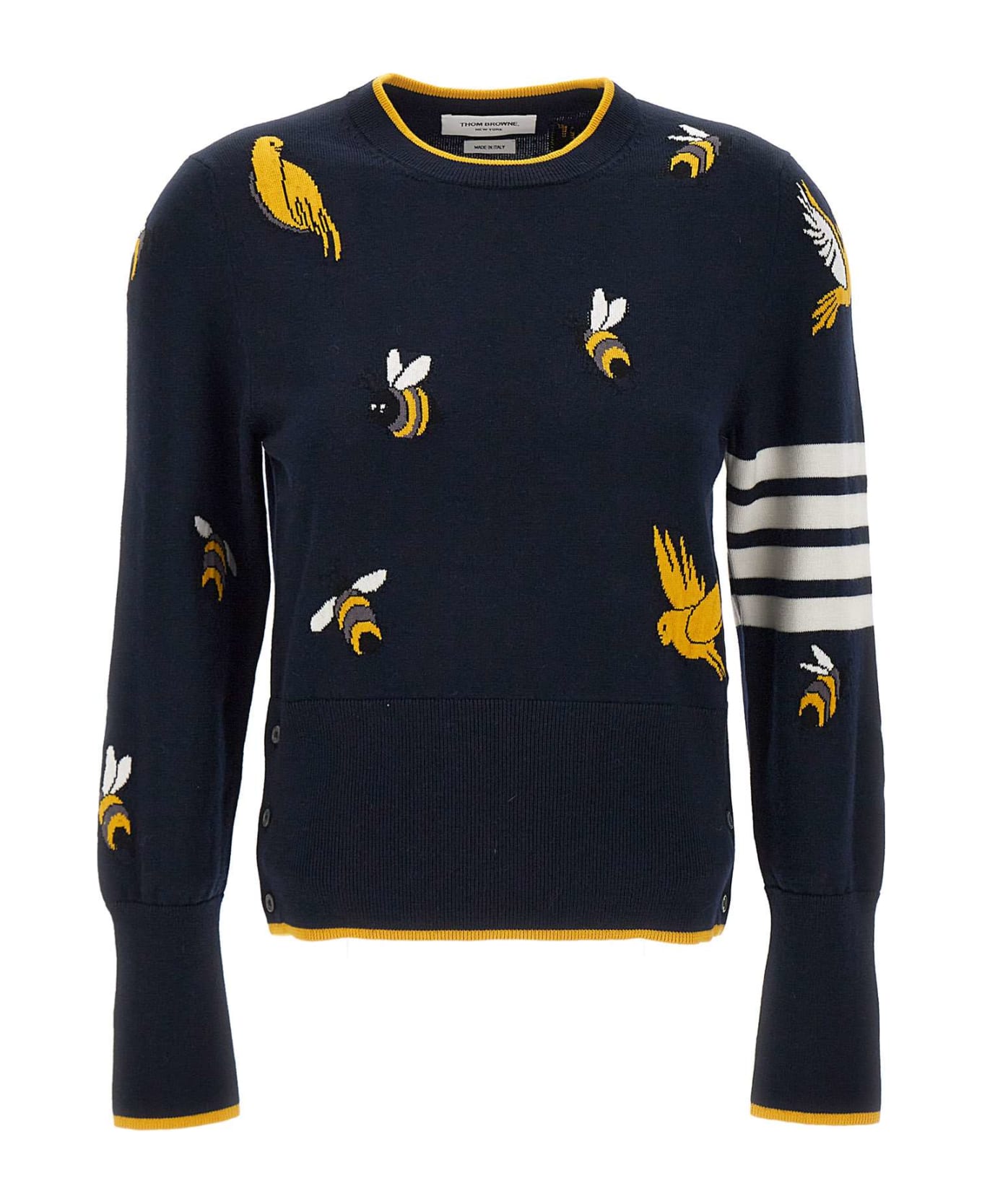 Thom Browne "Birds Bees Half Drop " woman cotton pullover, navy blue, long sleeves, crew neck, ribbed edges, all over birds and bees pattern in yellow and white tones, gros-grain loop on back of neck, hem with buttoned side vents, regular fit, ideal in high and low season. Made in Italy.