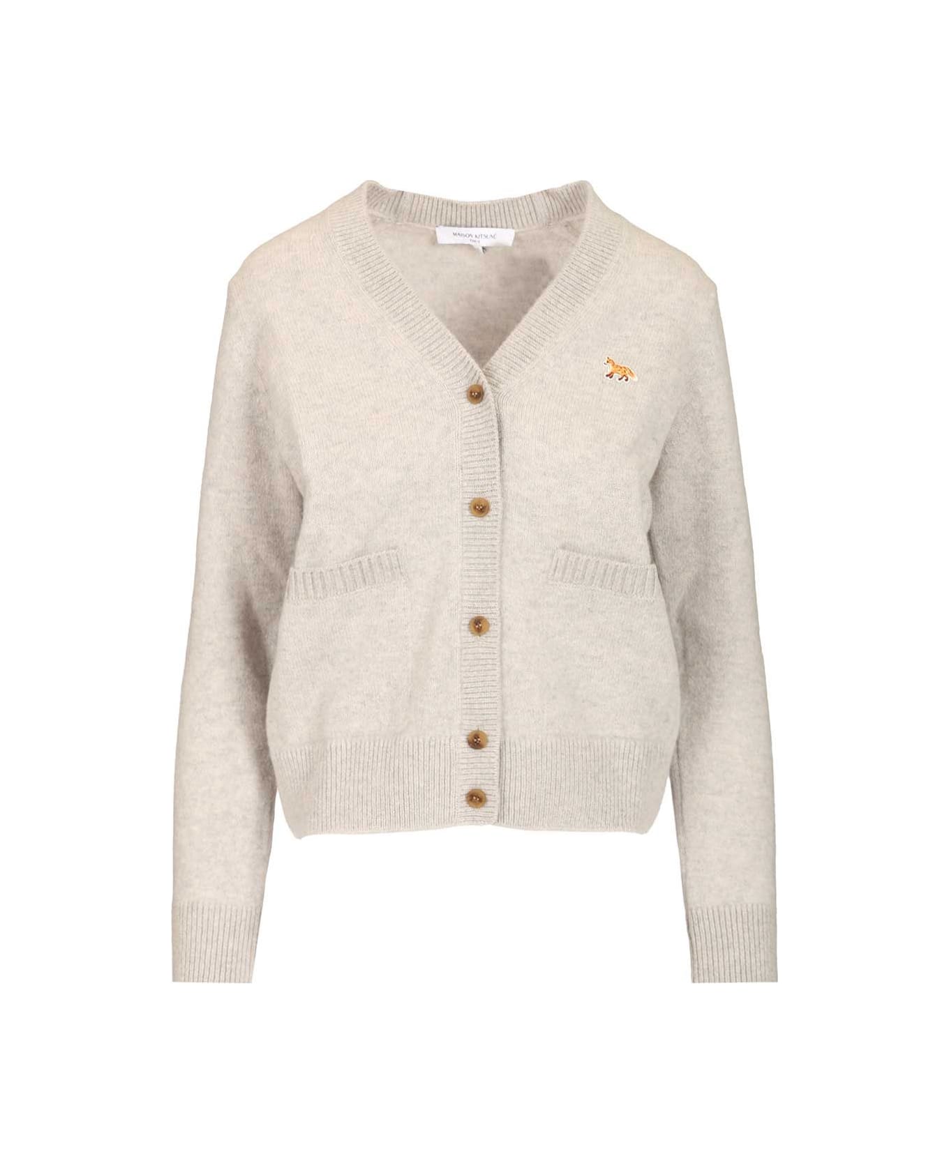 Maison Kitsuné lambswool 'Baby Fox' cardigan, featuring a boxy fit, a Maison Kitsuné engraved button fastening, two front patch pockets, ribbed knit collar, cuffs and hem, and an embroidered Baby Fox patch on the chest.
