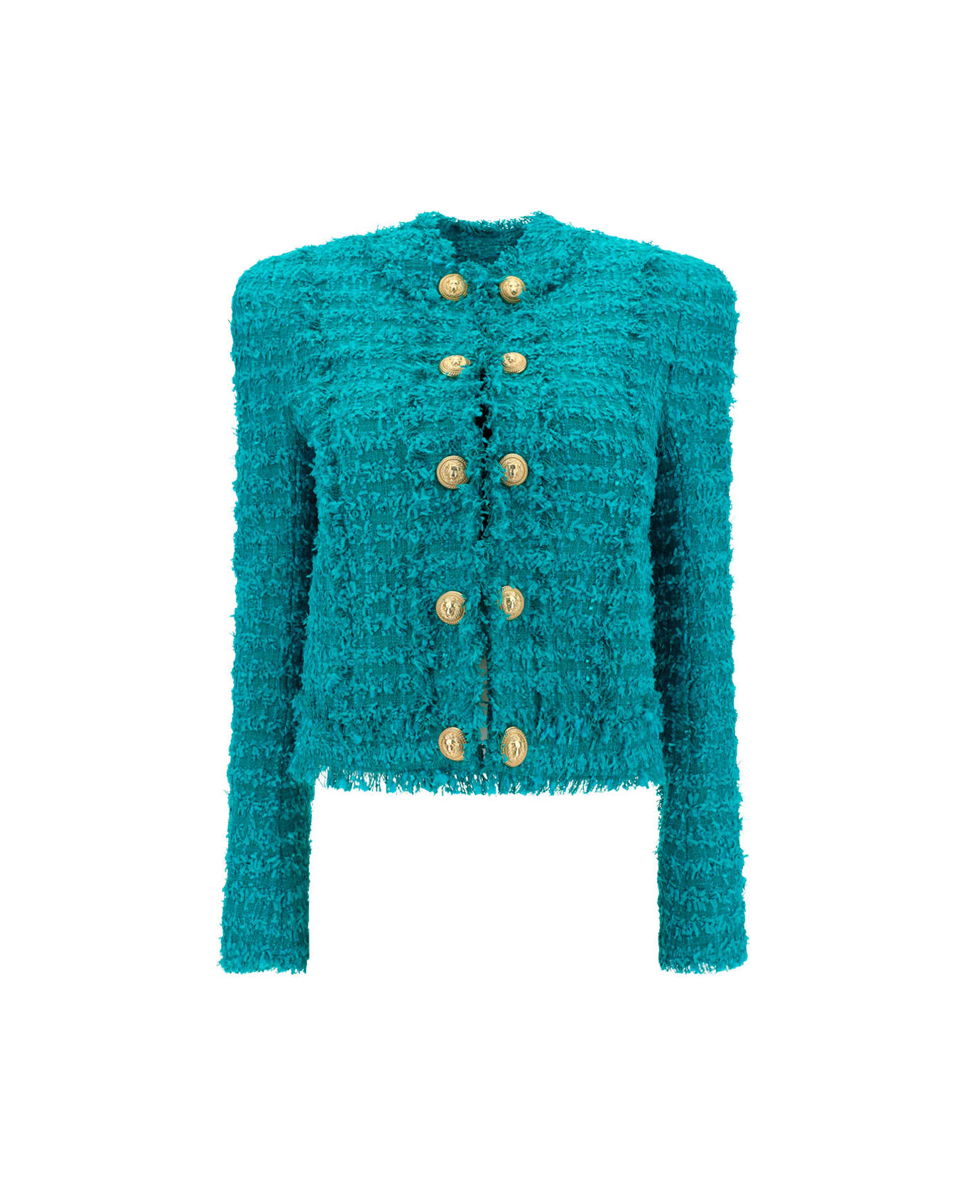 Collarless tweed jacket by balmain, all-over frayed design, contrasting double button front closure, structured shoulders, slim fit. Composition: 30% % Cotton, 1% % Metal Metallic Metallised, 19% % Acrylic, 50% % Polyamide