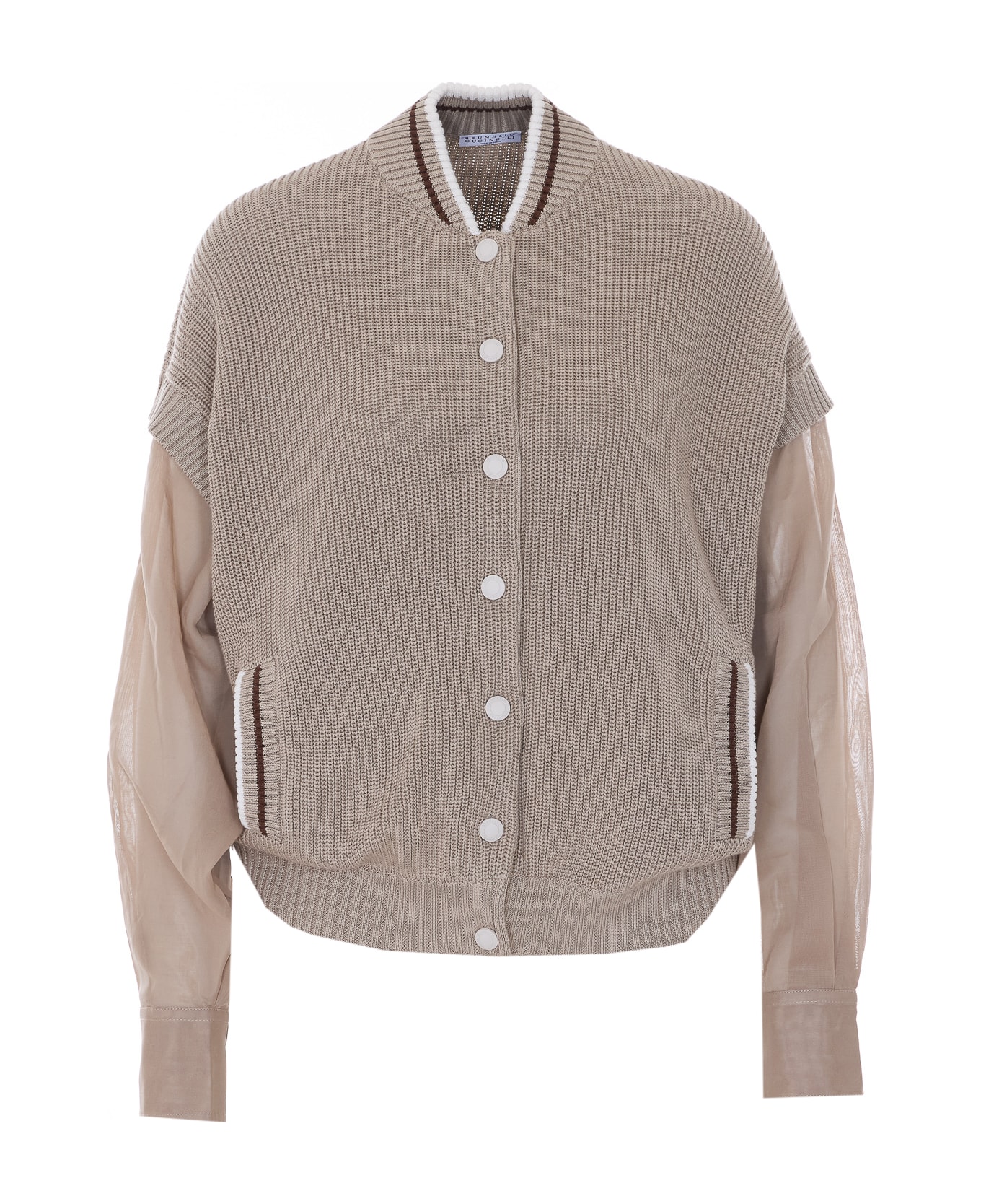 Brunello Cucinelli beige knitted cardigan with frontal buttons closure, long sleeves, lateral pockets, transparent effect on sleeves