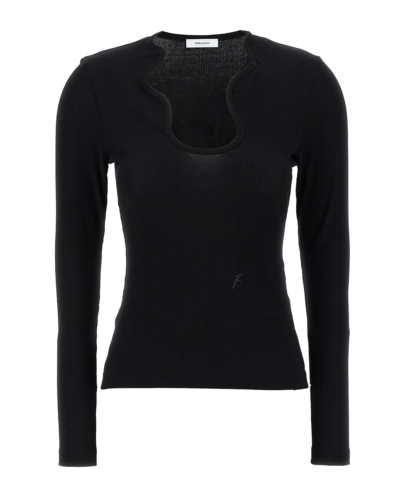 Ribbed cotton sweater with deep contoured neckline, tone-on-tone embroidered logo on the front, and long sleeves. Composition: 100% cotton