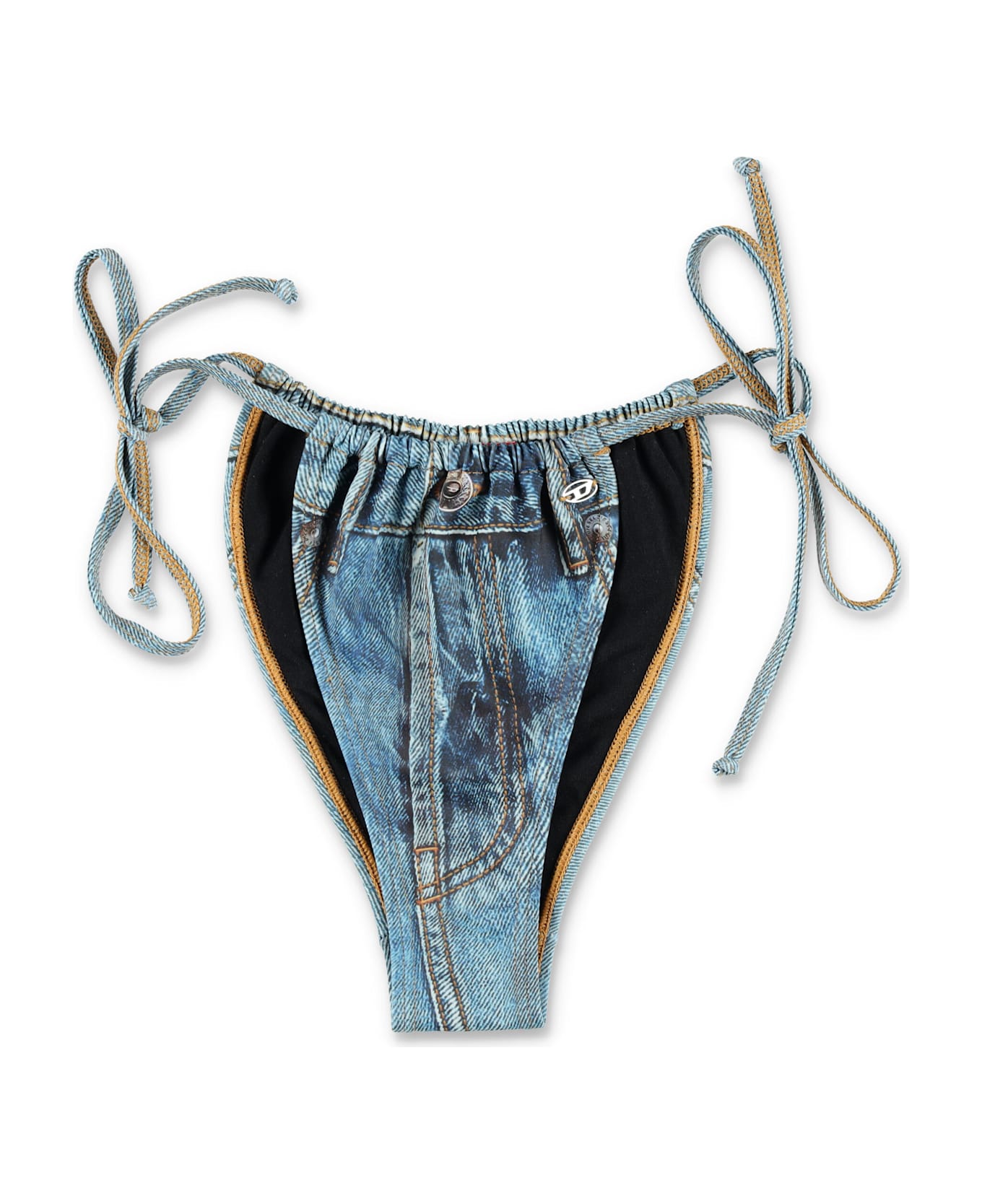 This Diesel Jodie-dnm Bikini Bottom Is Crafted In Stretch Recycled Fabric With A Realistic Denim Print. Side Ties Allow For An Adjustable Fit, While The Minimal Coverage And High-cut Leg Create A Sleek, Contemporary Look. Perfect For Pairing With Matching Tops For A Standout Swimwear Set. Stretch Recycled Fabric With Denim Effect Adjustable Tie-side Closures High-cut Leg For Modern Fit Minimal Coverage For A Sleek Silhouette Metal Logo Coordinates With Bikini Top Alessandra Is 1,75 M And Wears Size S