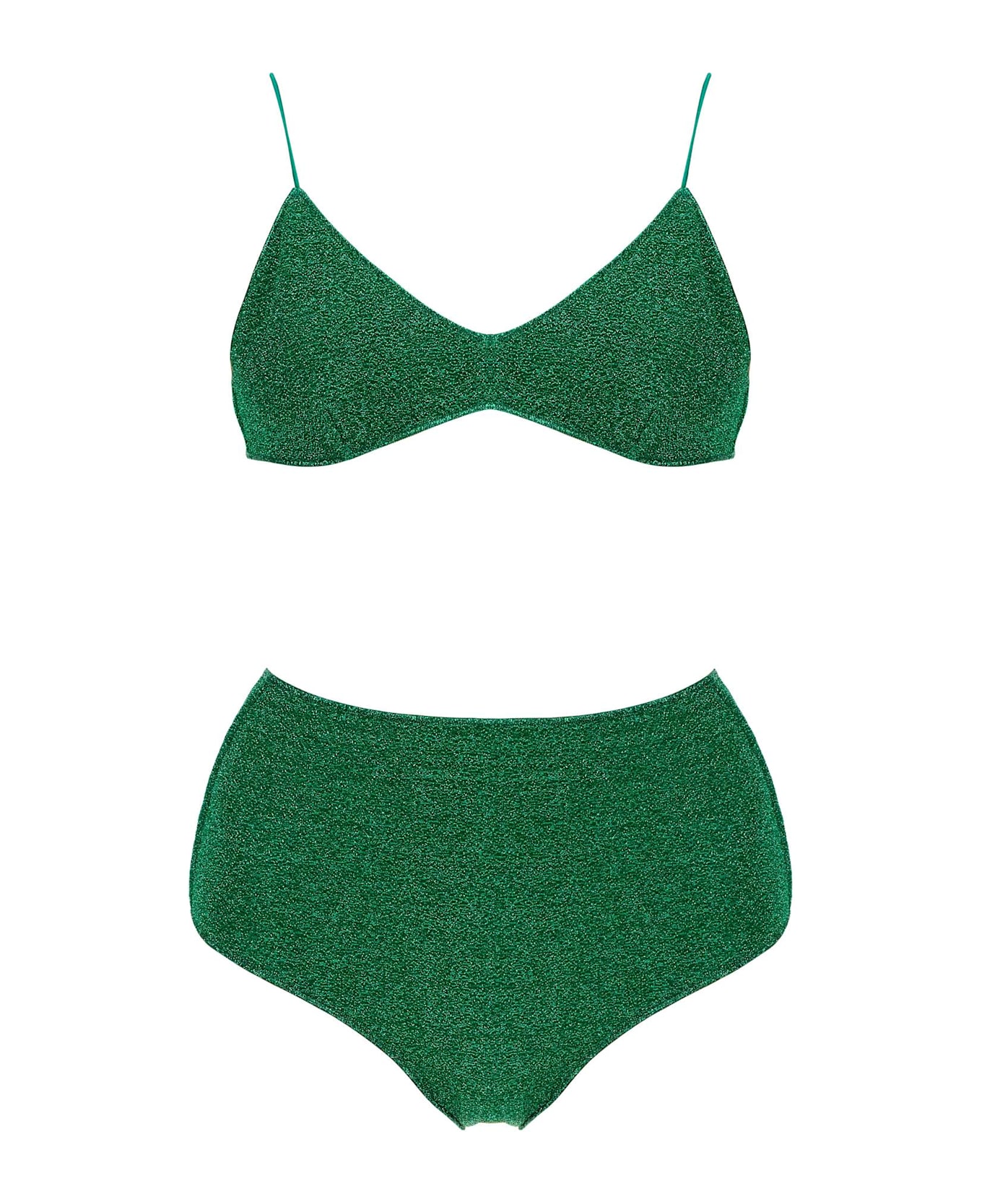 This Oséree lycra lurex bikini set is composed of a top with thin straps and high-waisted bottoms. The back closure can be adjusted with strings. The model is 177 cm tall and wears size S.