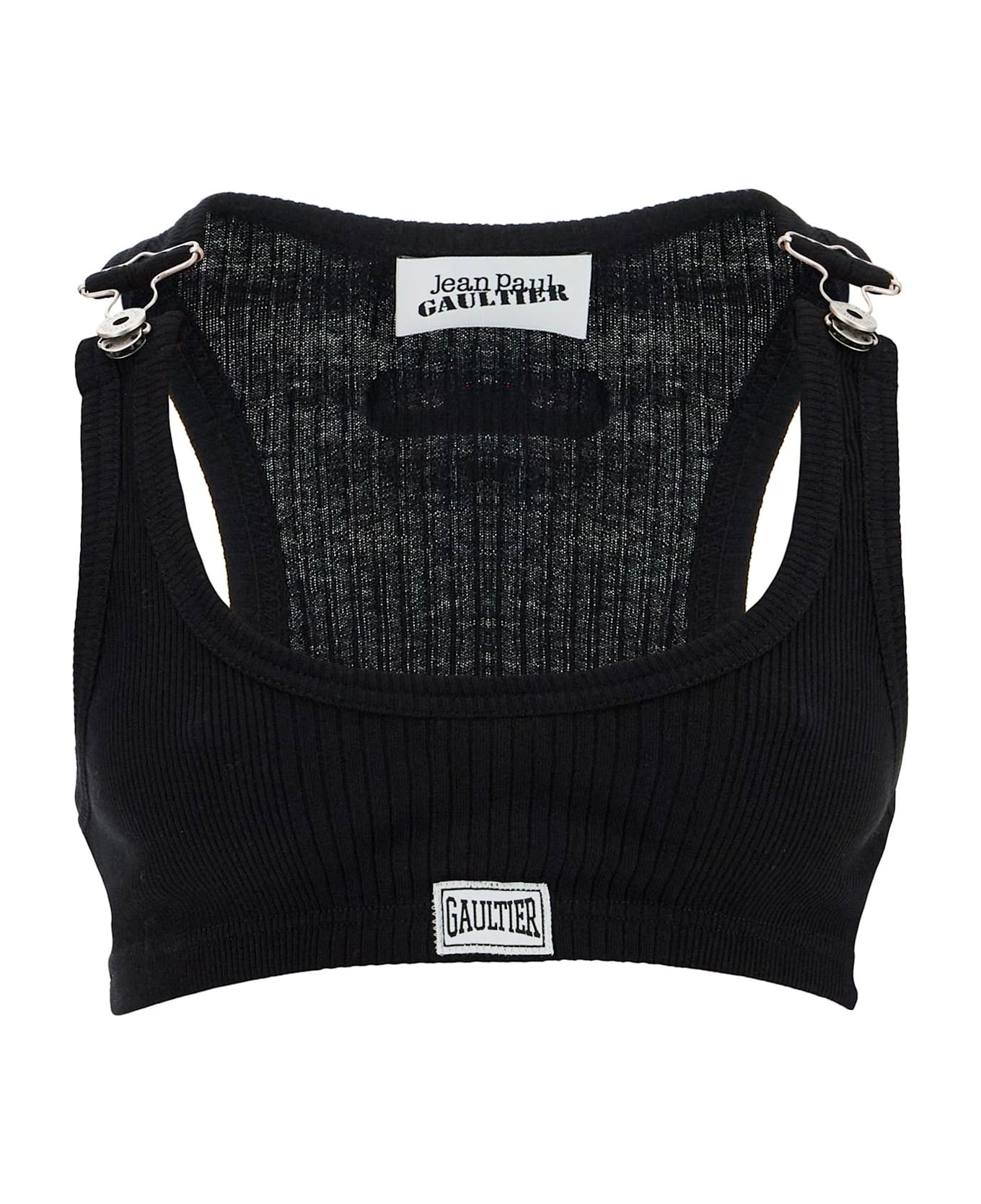 The black crop tank top by Jean Paul Gaultier offers bold style and comfort. Made from cotton with adjustable straps and metal clips, it combines innovative design and versatility for casual and elegant looks.