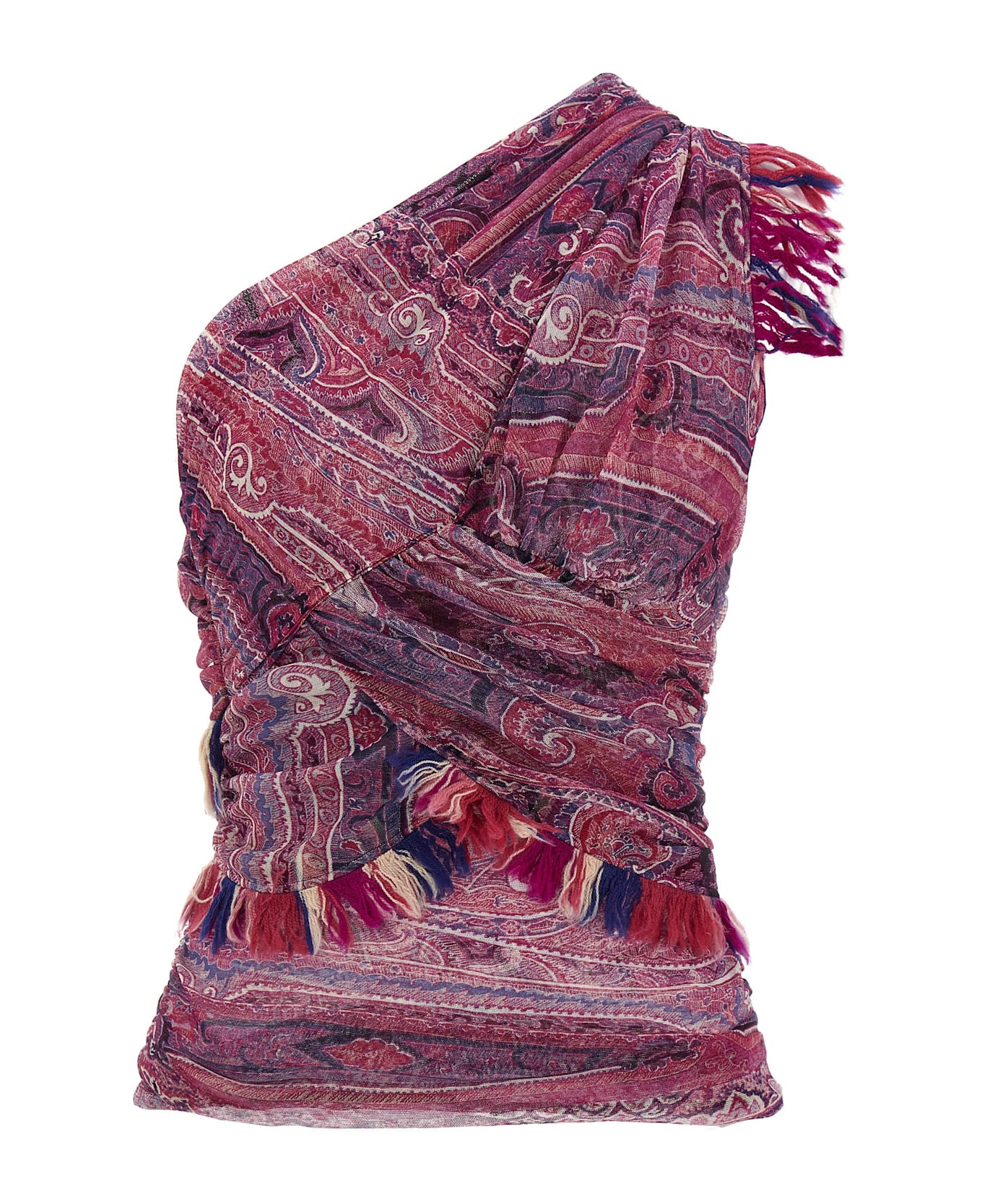 'Devona' top in draped stretch tulle with all-over print, asymmetric one-shoulder model with fringes, side zip closure. Composition: 100% polyamide