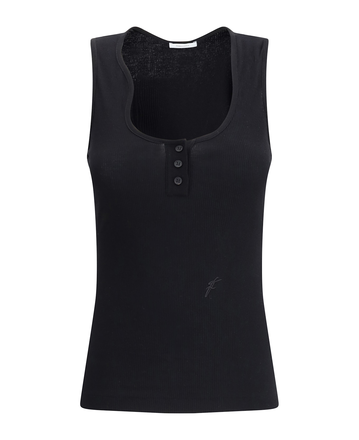 Ferragamo's ribbed top is an elegant and simple garment, ideal for those seeking a sophisticated yet casual style. the rounded front neckline gives a delicate touch, while the three-button front closure adds a practical and stylish detail. the iconic stitched logo on the front represents the brand discreetly, adding a distinctive element without excess. made of ribbed knit, this top offers a snug and comfortable fit, perfect for pairing with casual or more dressy looks.