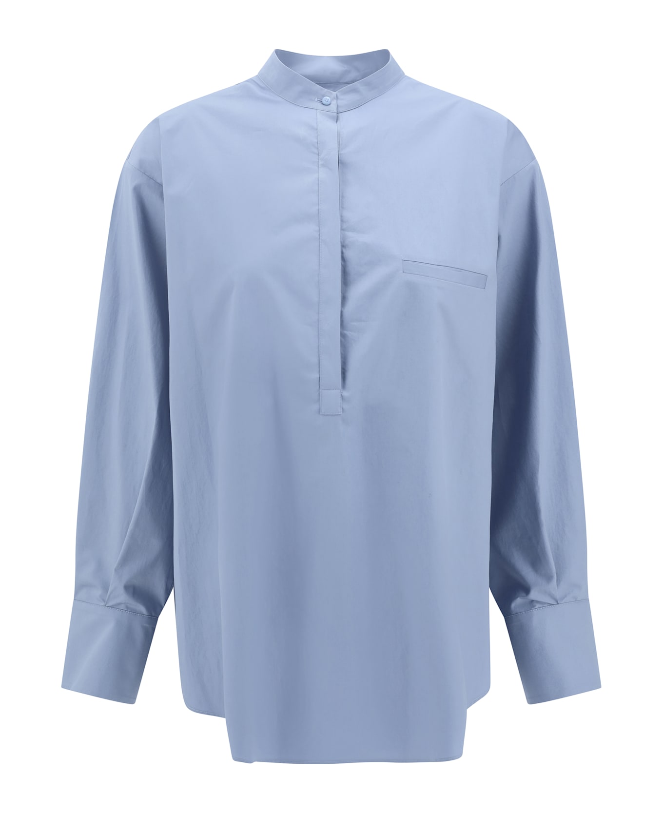 Sa su phi's baloon shirt is a sleek, modern garment featuring a round neck that adds a touch of sophisticated simplicity. the half-bust front closure with concealed buttons gives a clean, minimalist look, while the welt pocket on the front offers a functional and discreet detail. the shirt's loose, balloon-like design creates a fluid, dynamic silhouette perfect for a contemporary, refined look.