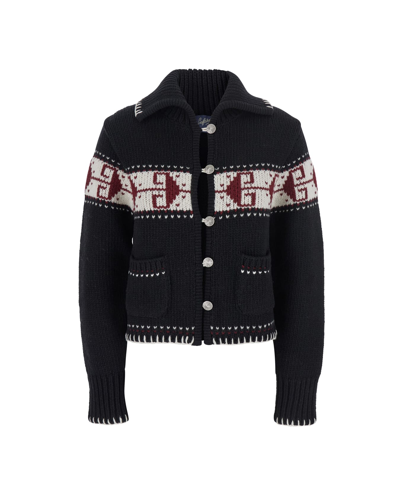 Sweater Black Spread collar Long sleeves Front button closure Two front patch pockets Straight hem Fair Isle motif Contrasting stitching Wool blend Regular fit