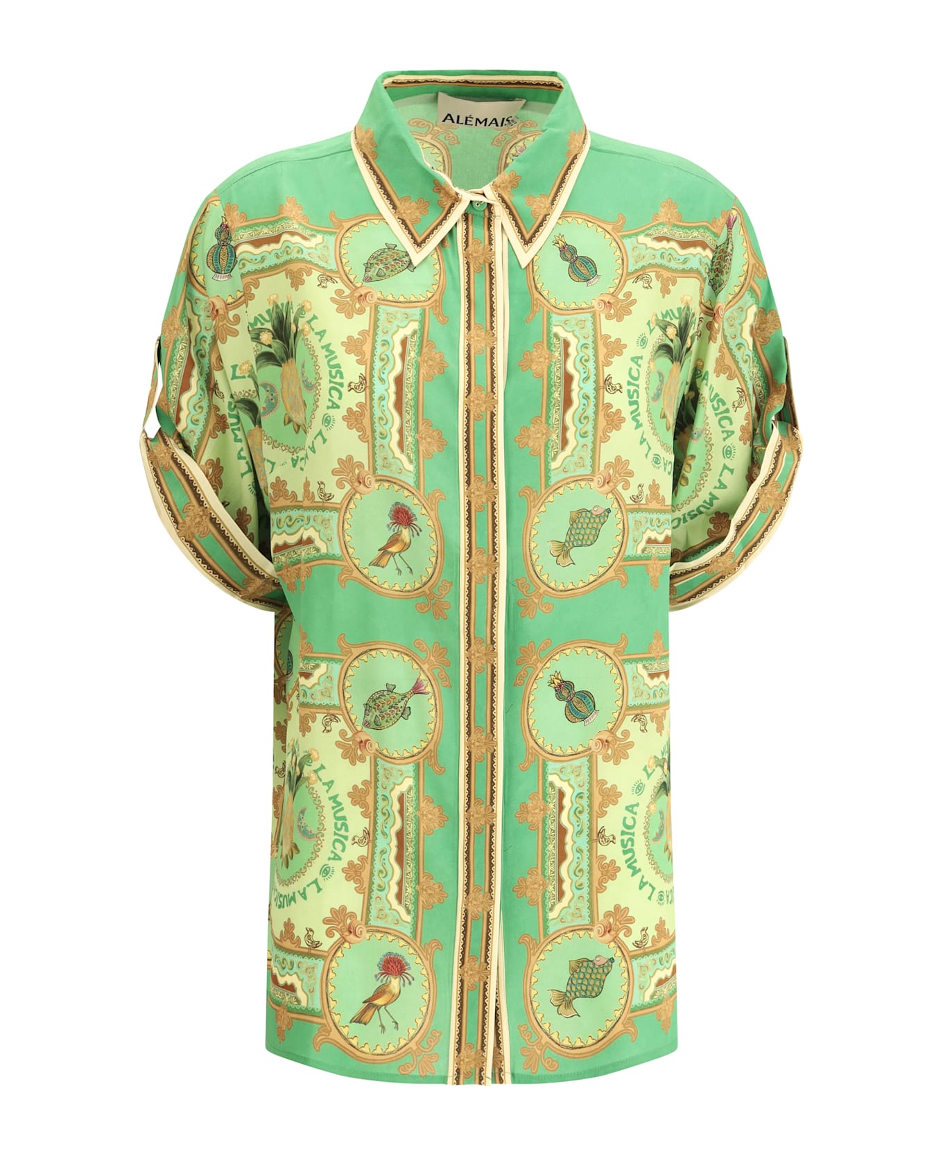 Silk la musica shirt by alémais, short-sleeved design, classic collar, front button closure, multicolored pattern, loose fit.