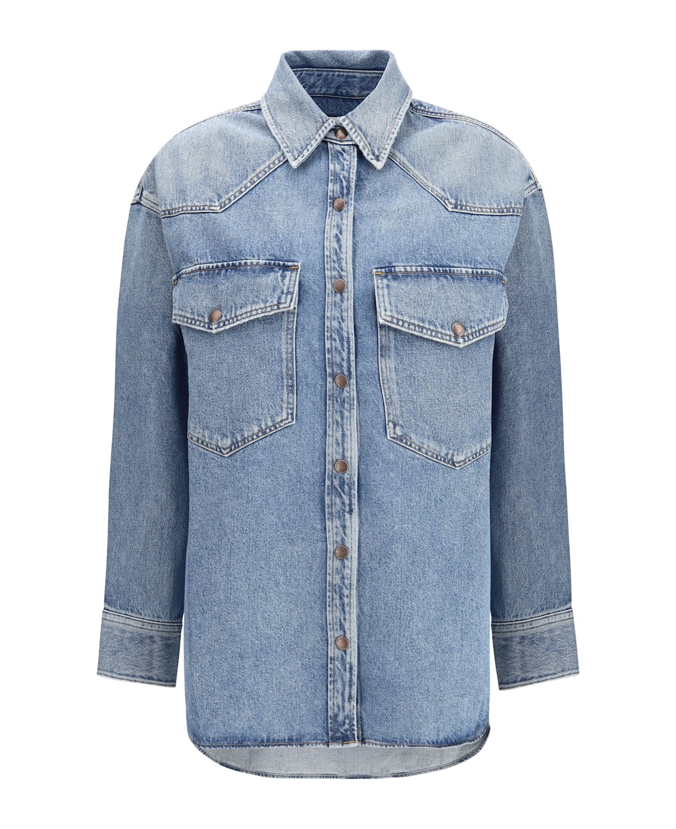 The lotta shirt by agolde is a structured denim essential inspired by classic western styling. crafted from rigid regenerative cotton in a medium indigo wash, it features a pointed yoke, snap button closure, and flap chest pockets. the non-stretch denim offers a clean, heritage look with a soft feel for all-day comfort. perfect worn open over a tee or buttoned-up for a refined take on classic denim.