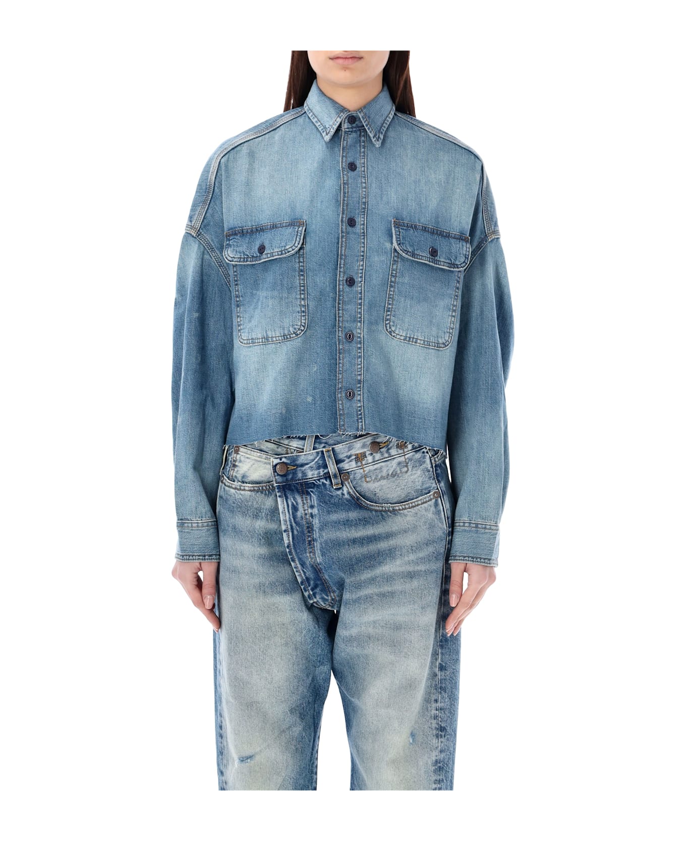R13 s Cropped Denim Shirt Features An Oversized Silhouette And Distinctive Proportions, With A Shorter Front And Extended Back. Classic Patch Pockets, A Pointed Collar, And Buttoned Cuffs Enhance Its Authentic, Edgy Appeal, Turning A Staple Denim Piece Into A Statement Layer. Oversized Fit Cropped Front Length Elongated Back Panel Pointed Classic Collar Front Button Closure Two Buttoned Patch Pockets Long Sleeves With Buttoned Cuffs Nadege Is 1,72 M And Wears Size S