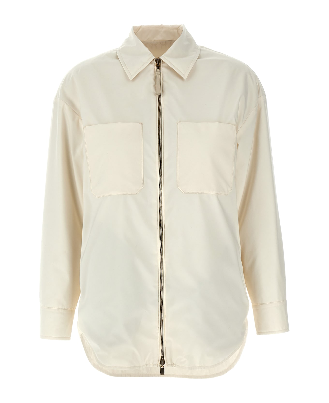 Slightly padded reversible jacket in solid color synthetic fabric and all-over monogram logo, collar, zip closure, pockets, long cuffed sleeves.