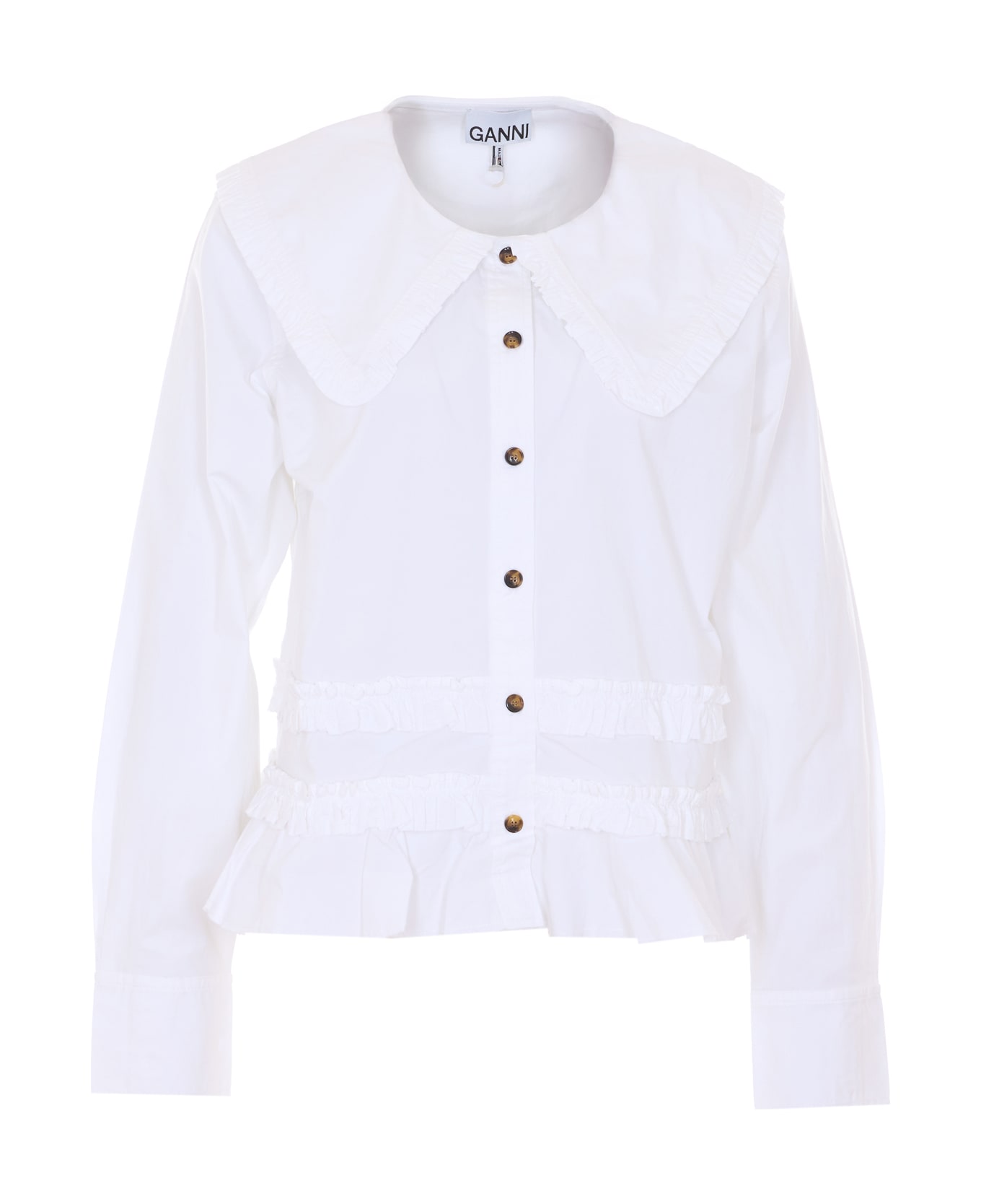 Ganni white blouse, frontal buttons closure, with rouches, ruched and wide collar Composition: 100% Cotton