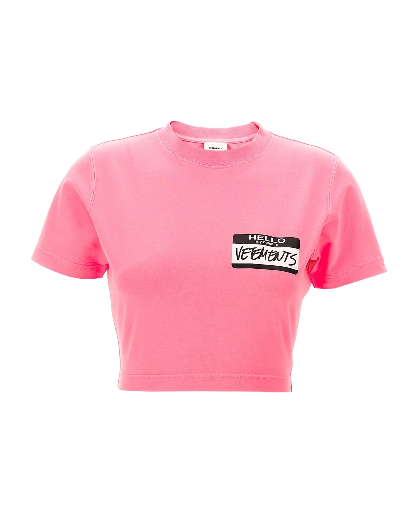 'Hello My Name Is Vetements' cotton cropped T-shirt with front logo print, crew neck, short sleeves. Composition: 93% cotton, 7% elastane