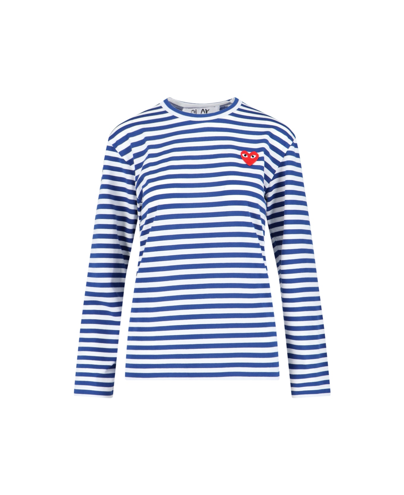 Comme des Garcons Play striped t-shirt in white cotton with blue striped pattern, crewneck, red logo patch on the chest, and straight hem.