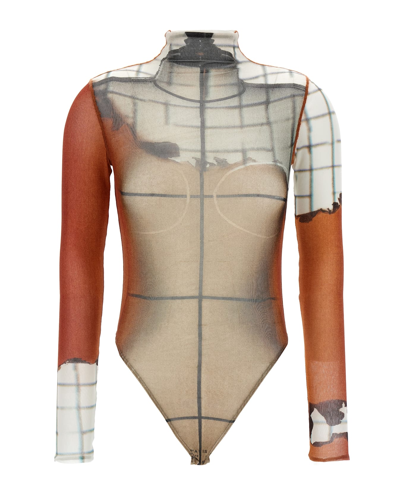 All-over 'The Fire' print stretch tulle bodysuit, draped solid tulle lining, high neck, long sleeves, snap buttons on the hem, and high-leg. Composition: 100% polyamide