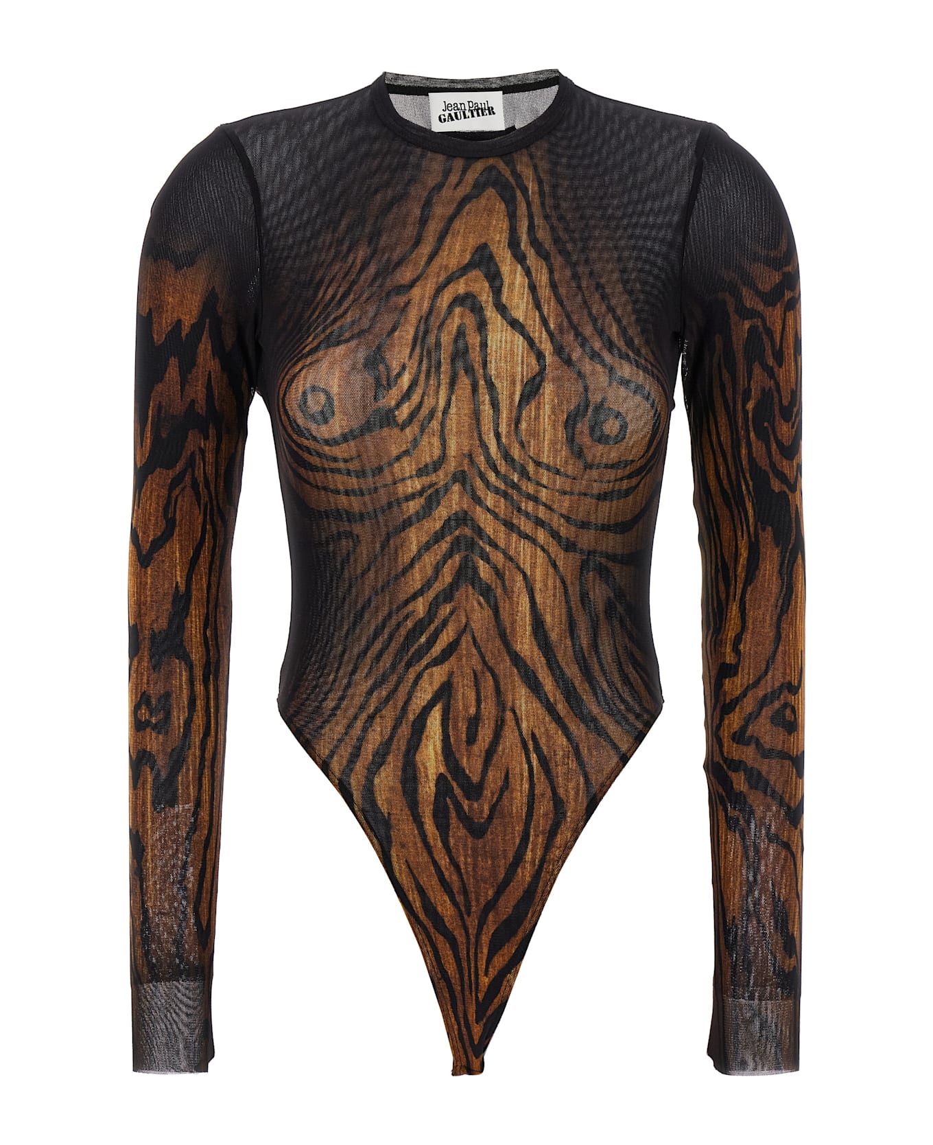 All-over 'The Wood' print stretch tulle bodysuit, solid tulle lining, back draping, crew neck, long sleeves, snap buttons on the hem, and high-leg. Composition: 100% polyamide
