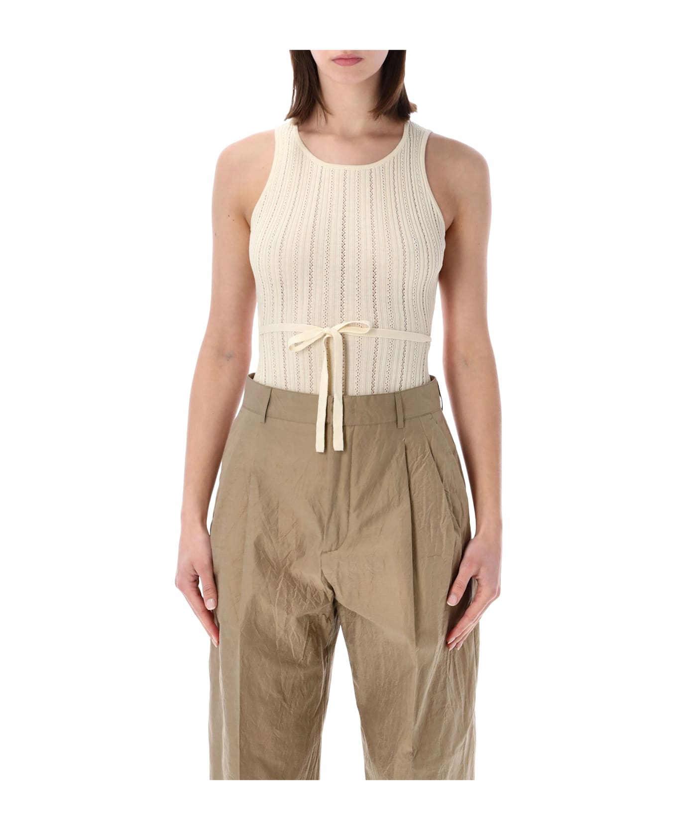 The Sessùn Andrade Bodysuit Blends Elegance And Texture In A Sleeveless, Round-neck Design. Crafted From Soft Cotton Yarn With Ribbing, Openwork, And Mesh Stitches, It Features A Cut-out Back And Tone-on-tone Waist Ties For A Flattering Silhouette. Sleeveless, Round-neck Design Cotton Knit With Ribbing, Openwork, And Mesh Stitches Cut-out Back With Adjustable Waist Ties All-over Openwork Detailing Alessandra Is 1,75 M And Wears Size S
