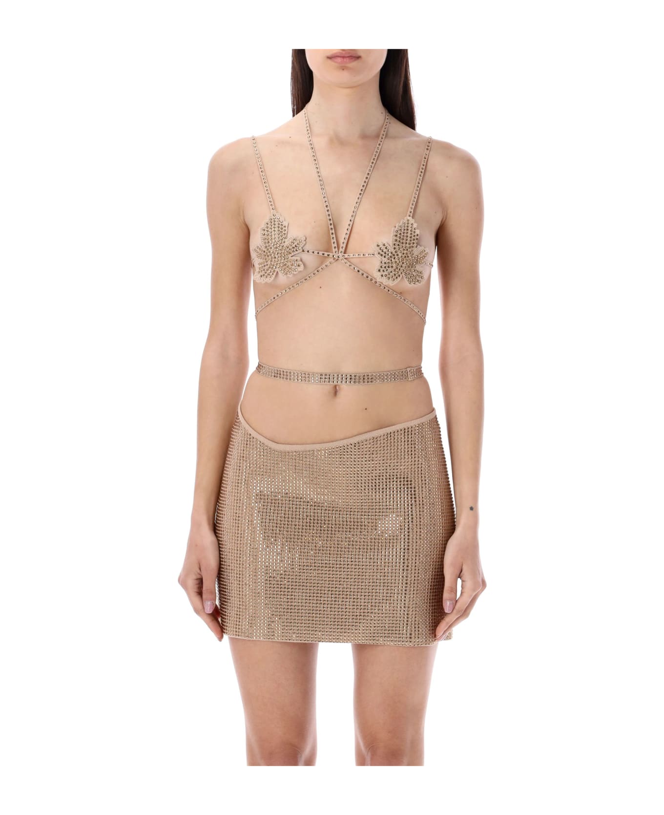 Full Strass Fig Leaf Bra By Andreadamo. Featuring: Leaf Shape Cups Multi-straps With Tonal Rhinestones Halterneck And Back Fastening Model Is 1,72 M Tall And She Is Wearing Size S