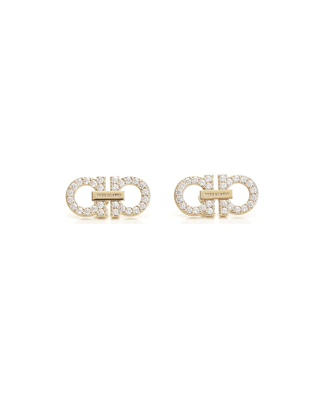 Ferragamo gold-plated brass double "Gancini" earrings with crystals, featuring a geometric double Gancini profile, decorated with crystal pavé, a central plate joining the two elements with an engraved signature. Composition: 80%BRASS 20%CRYSTAL # # #