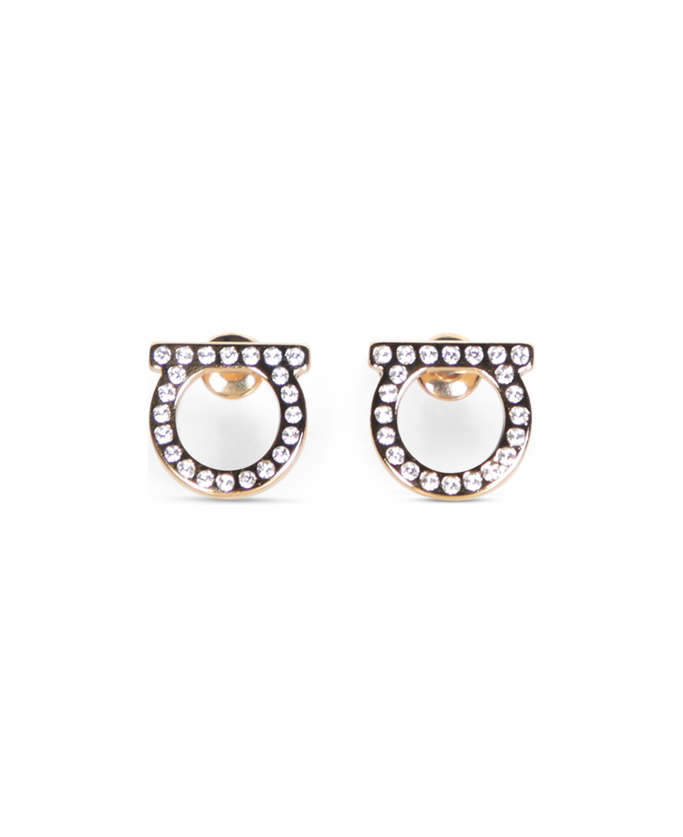 These elegant Ferragamo gold earrings, enriched with a row of sparkling rhinestones, beautifully catch the light, making them ideal for adding a touch of glamour to any outfit. Composition: 90% Brass, 10% Glass