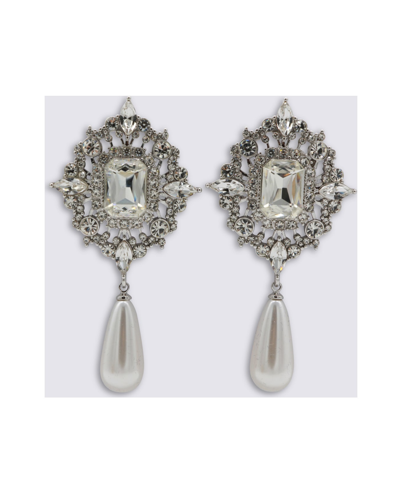 Silver and pearl earrings from Self-Portrait featuring butterfly closure, pearl details and crystal elements.