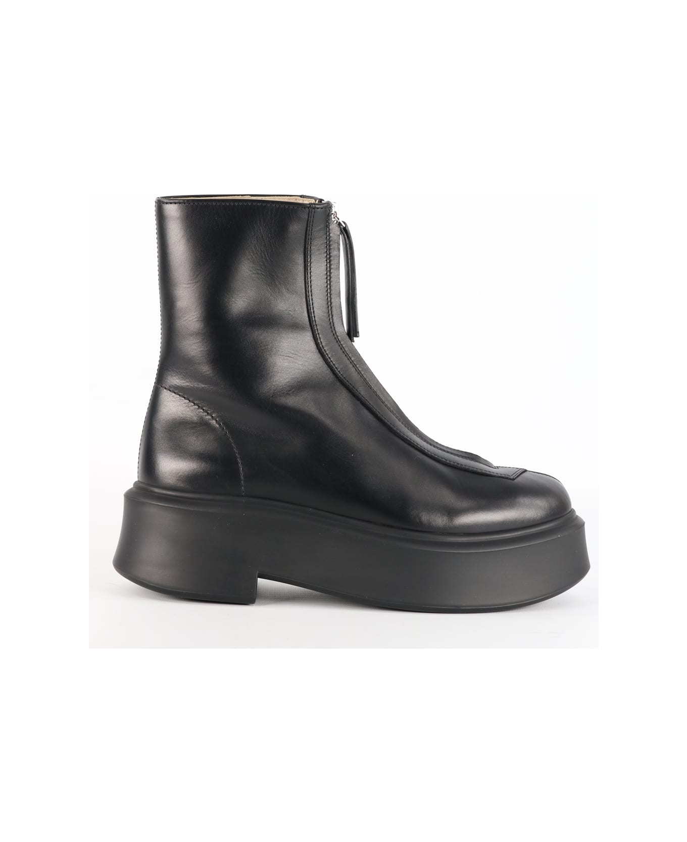 Black leather ankle boots with rubber platform sole. Features front closure with ti and leather puller. Leather interior Heel: 5 cm